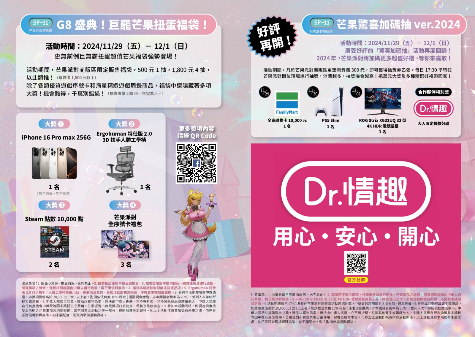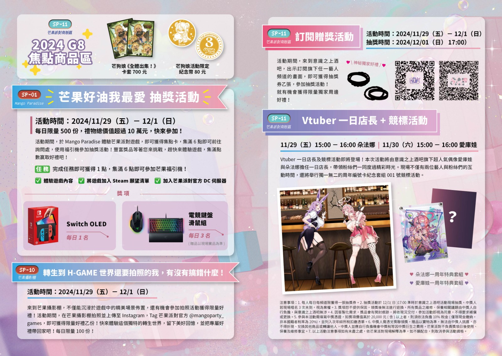 台湾游戏发行商芒果派对(Mango Party)宣布再度参战今年「G-EIGHT」游戏展,本届再次带来多达 30 款的游戏现场试玩,同时为回馈玩家支持,摊位将继续推出集点、抽奖、福袋等活动,最高有机会带走 PS5、Nintendo Switch、iPhone 16 等限量好礼。