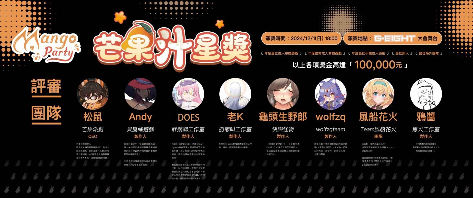 同时,芒果派对今年独家赞助,为成人游戏类增设「芒果汁星奖」共 5 个奖项,集结了 8 位海内外专业评审,将选出「年度最佳成人游戏」、「年度优秀成人单机游戏」、「年度最佳手机成人游戏」、「最佳新人」、「最佳海外团队」五项大奖,每项奖金高达 10 万元。