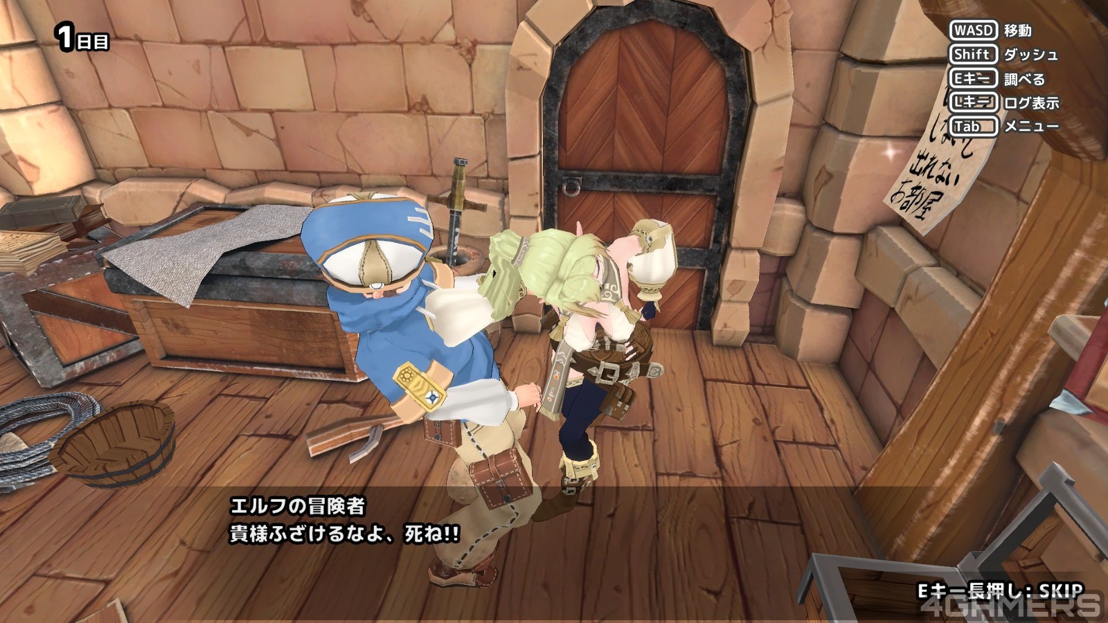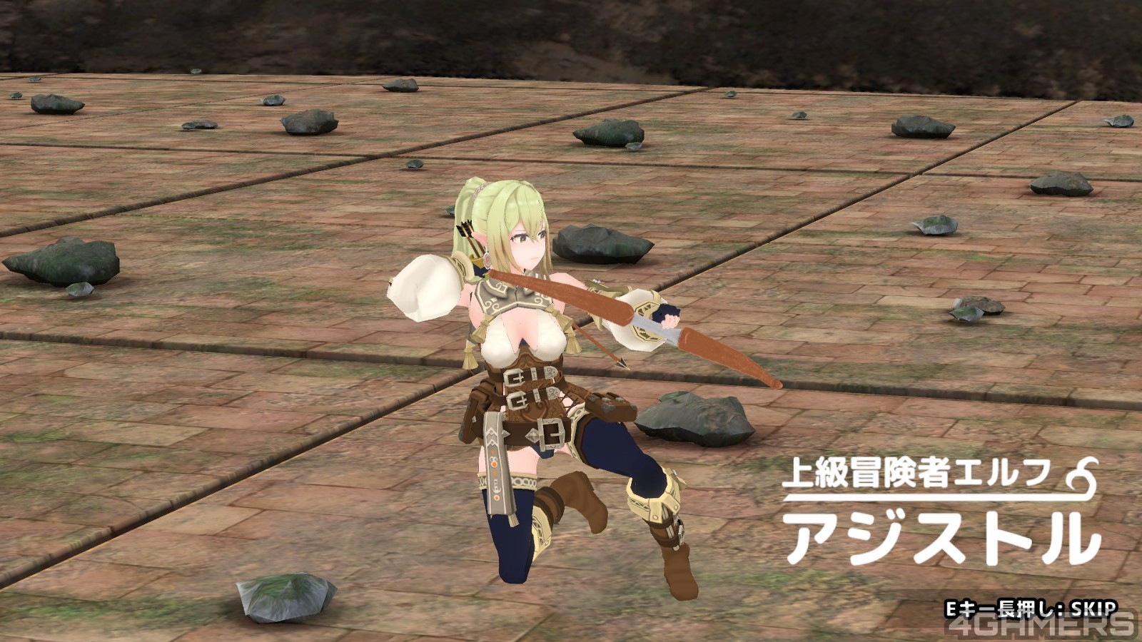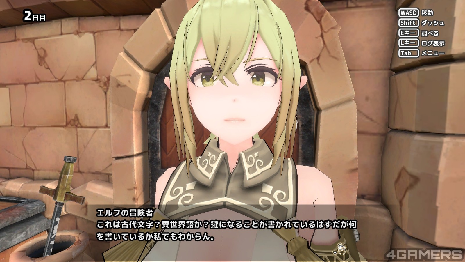 游戏一开始就看到一个美貌的百岁金髮精灵「阿基史特尔」(アジストル)与主角共同调查神秘的地下城,精灵武艺高强,把挡路的各种哥布林一箭一箭射倒,但是咱们的男主角:「杂鱼」(真的叫ザコ)却一点屁用都没有,只有扯后腿的份,还要女主角帮忙解救。