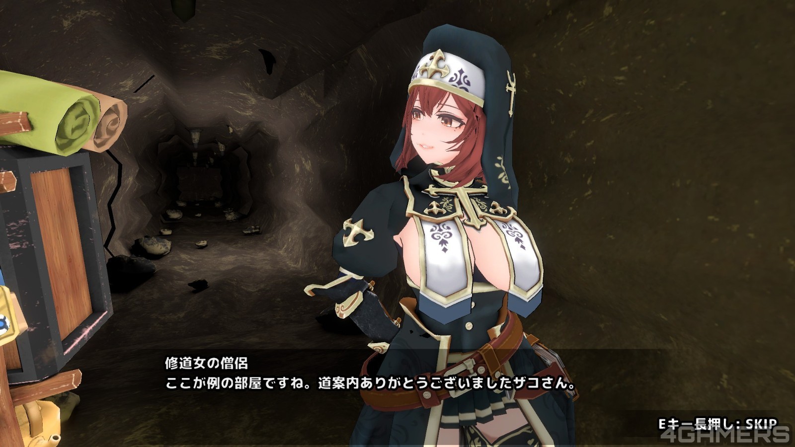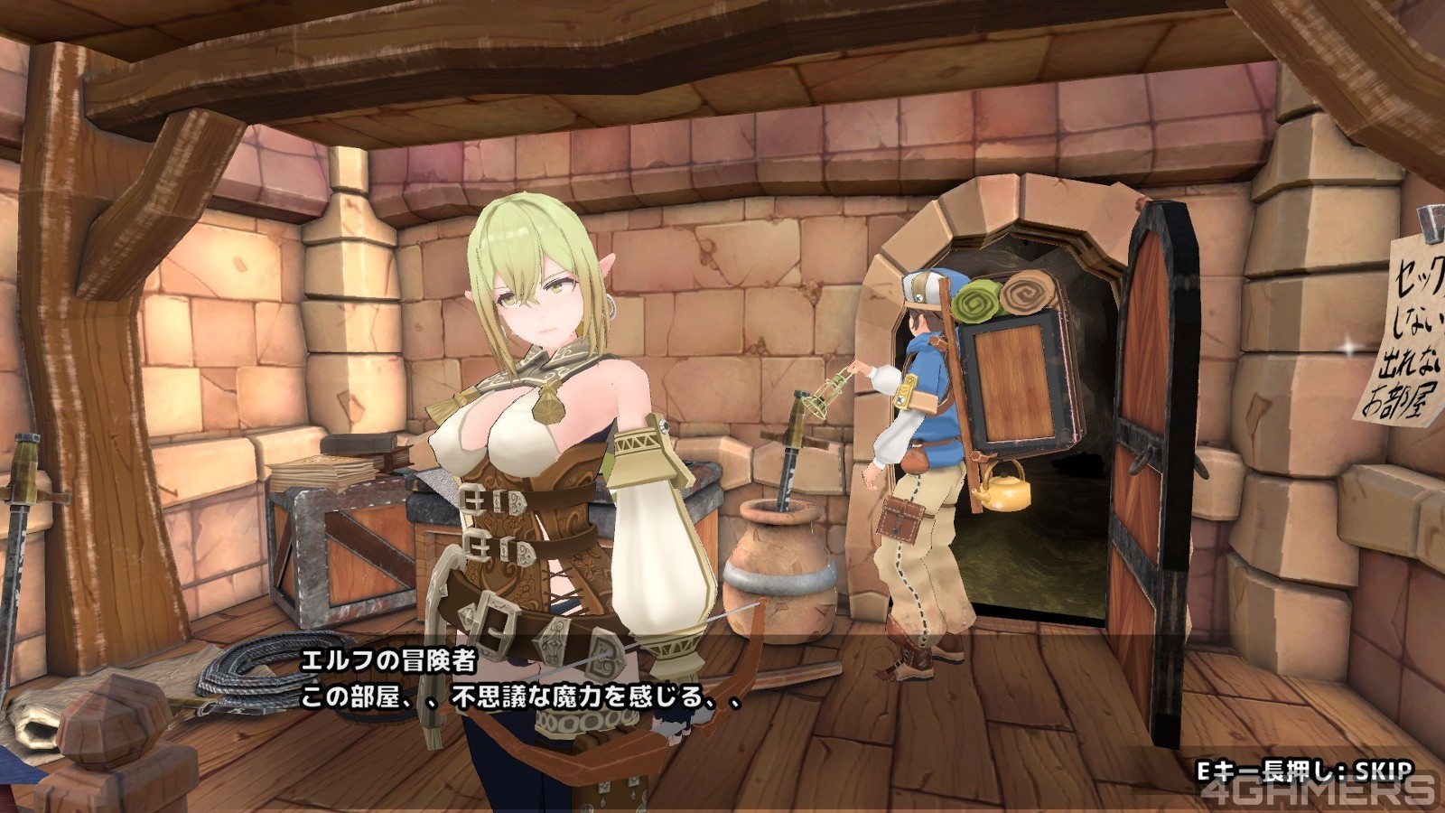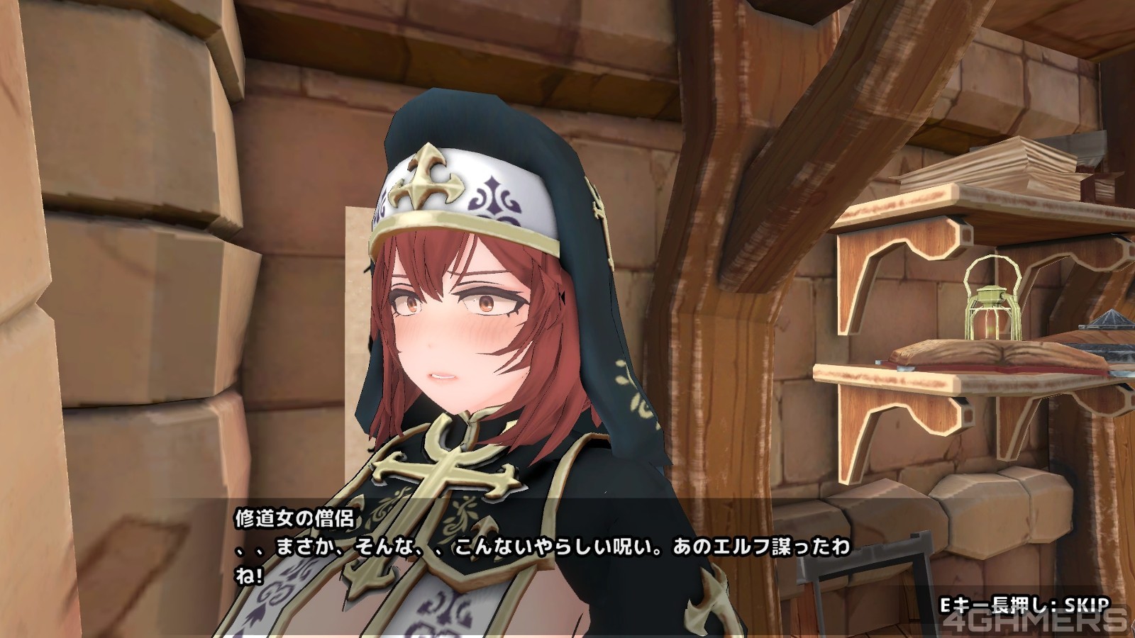 在两个人离开这间房间之后,故事并没有就此结束,过了不久,精灵就会跟负责发行冒险任务的修女伊卡鲁(イカル)因为冒险报酬的问题吵起来,而没事被砍薪水的精灵心头一把火,就提出要修女也帮她接一个任务的条件….这个任务就是「跟主角去调查某间遗迹的房间」…