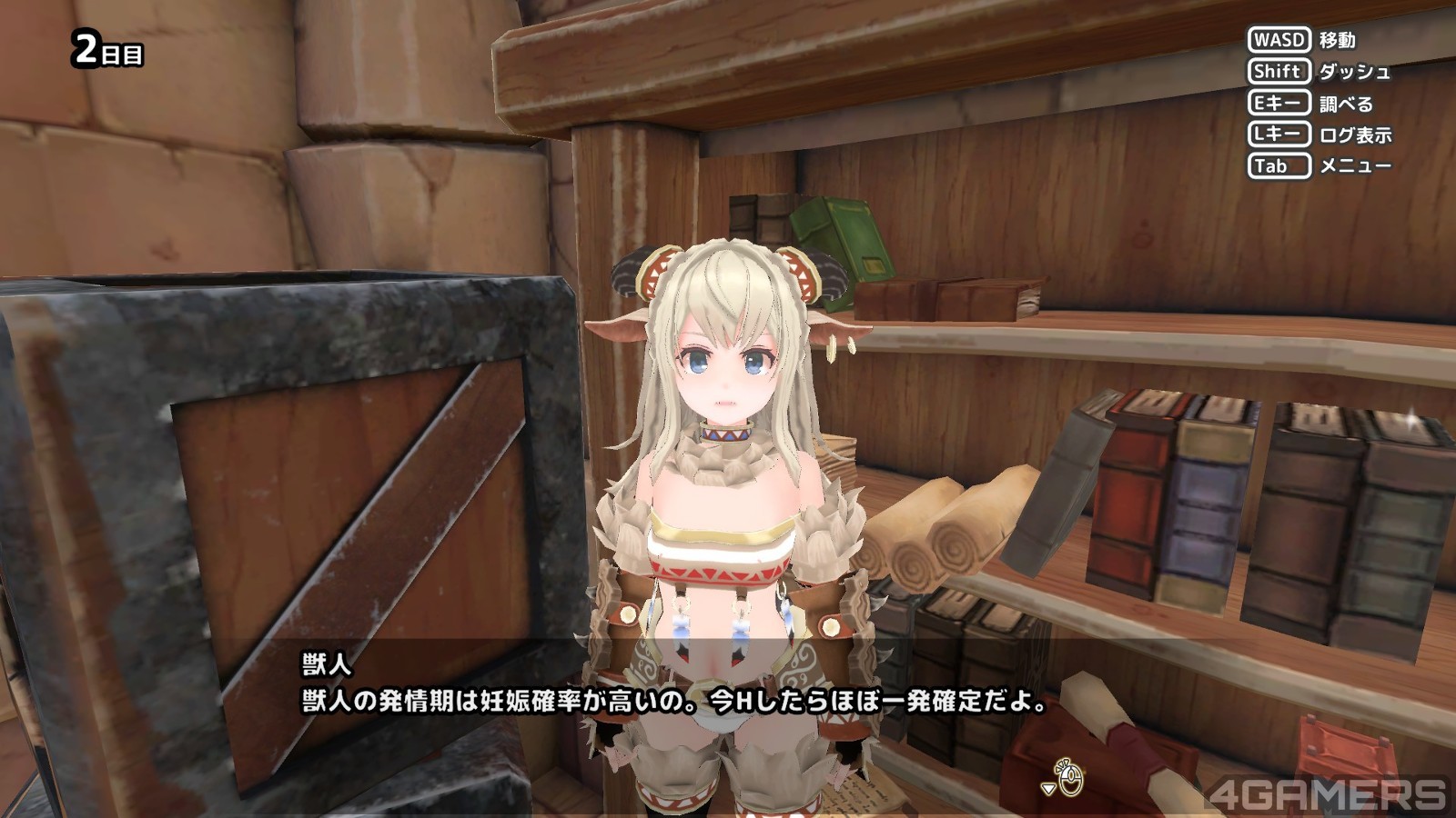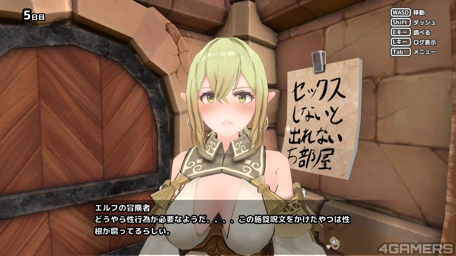 房间内能互动的物品不多,除了其他角色之外,最多还有墙上的各种告示以及书柜的笔记本能够翻阅,里面还会写一些提示之类的内容,例如说精灵很难怀孕啦,要有爱才会生,或是前一个被关进来的女生最后只好自己召唤触手才能离开的内容(因为被关进来的只有自己一个人)