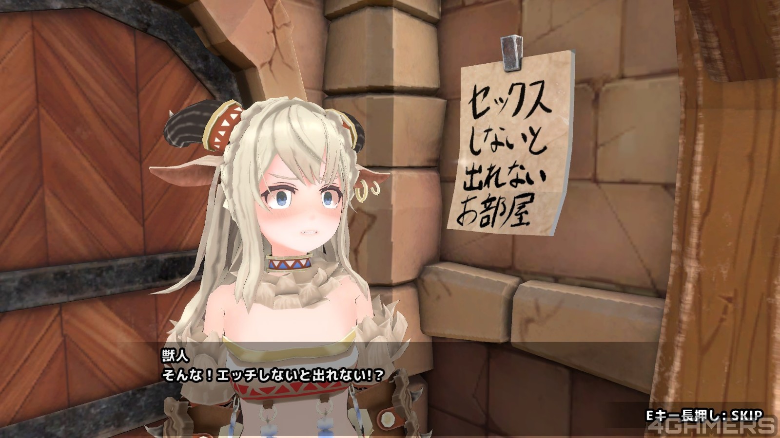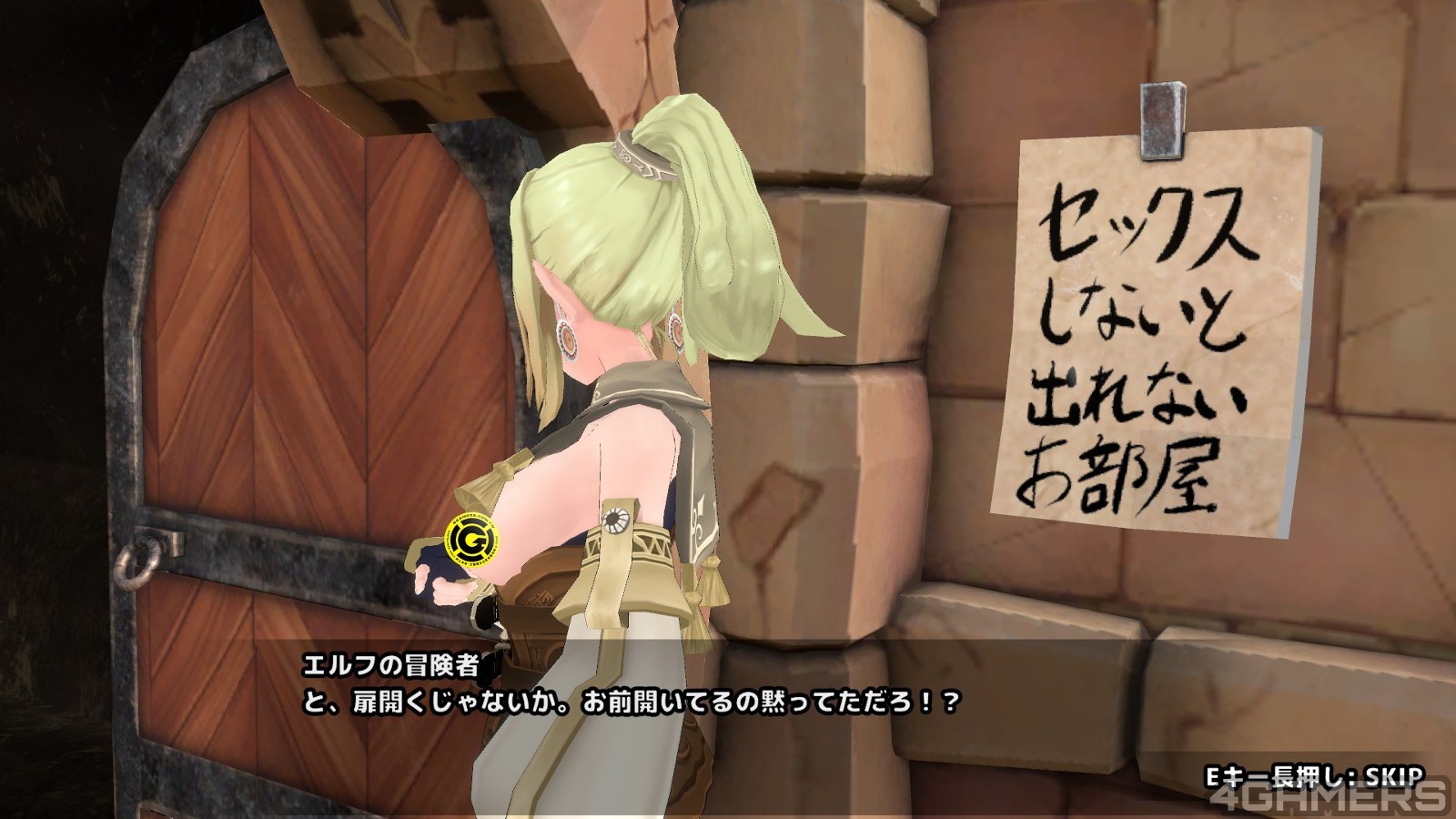 这房间里面摆满了各种杂物,还有一张大床,略嫌狭小,没有什幺奇怪的地方,除了墙上用日文贴着的告示「不打炮就出不去的房间」。但是很不幸的这个精灵没读书看不懂古代语言,自然就推着主角走进了这间房间…