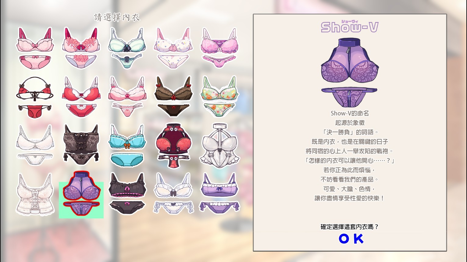 这里指的是流程而非玩法,因为在试玩版中,看似 20 套的内衣选择,即便女主角有事先要求希望的内衣款式,但在试玩版阶段,不管你选对选错,最终对话仍会导到正确的那套内衣。