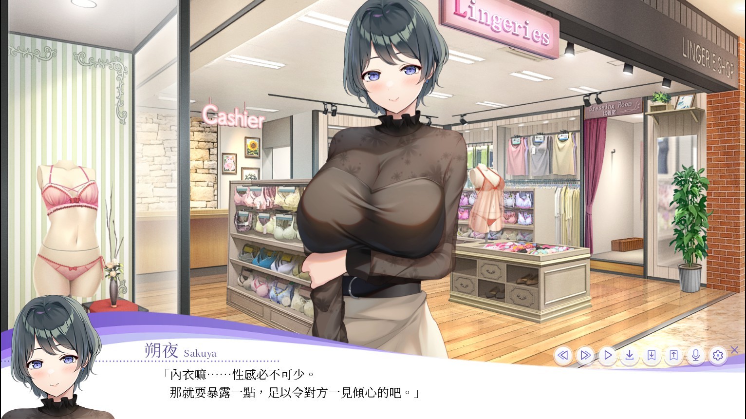 在试玩版中,玩家会邂逅游戏最初的两位女主角,分别是「LingerieS」店长「朔夜」以及咖啡店女服务生「爱洲」,而在序幕中则是展示了本作选搭内衣的流程。