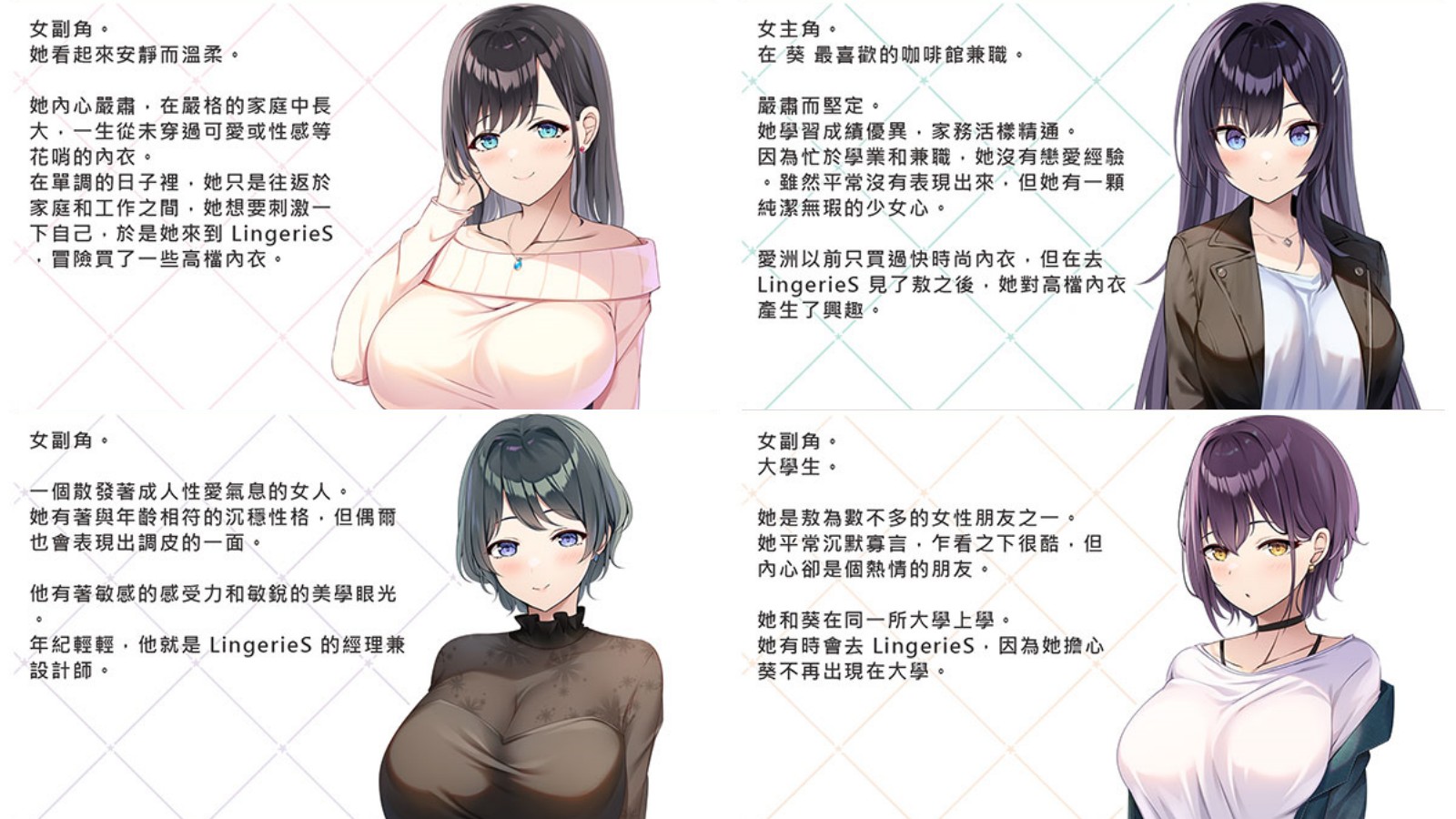 目前《LingerieS》共有 4 位女主角,每一位都有着 G 杯以上的傲人上围尺寸。