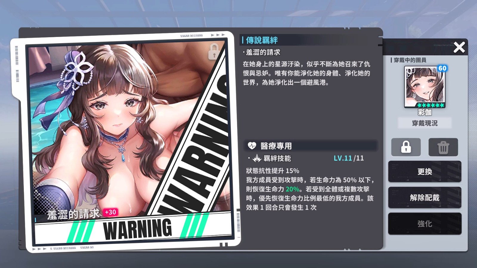 彩伽初登场就成为万众瞩目的超级新人,华丽且空灵的外表下,内心却藏有不为人知的秘密。专属羁绊名为「羞涩的请求」,在她身上的星源汙染,似乎不断为她召来了仇恨与忌妒。唯有你能净化她的身体、净化她的世界,为她净化出一个避风港。