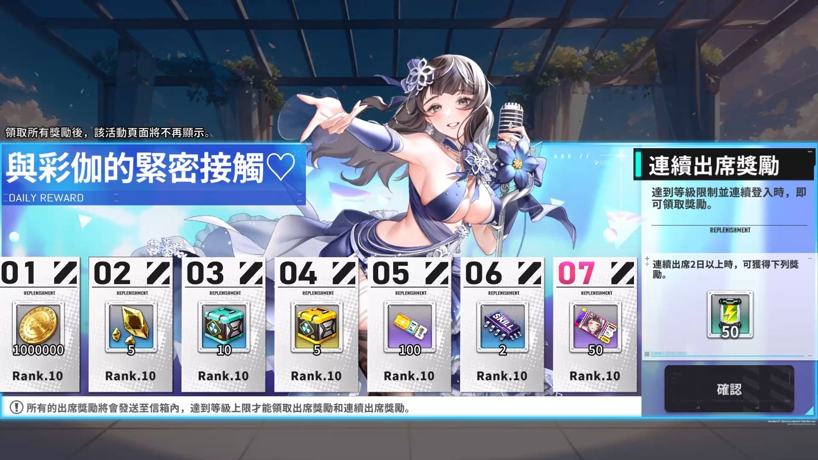河北彩伽合作专属七日签到活动「与彩伽的紧密接触♡」即日开放,登入游戏就能领取最多 50 张「彩伽」专属招募契约和多种道具。