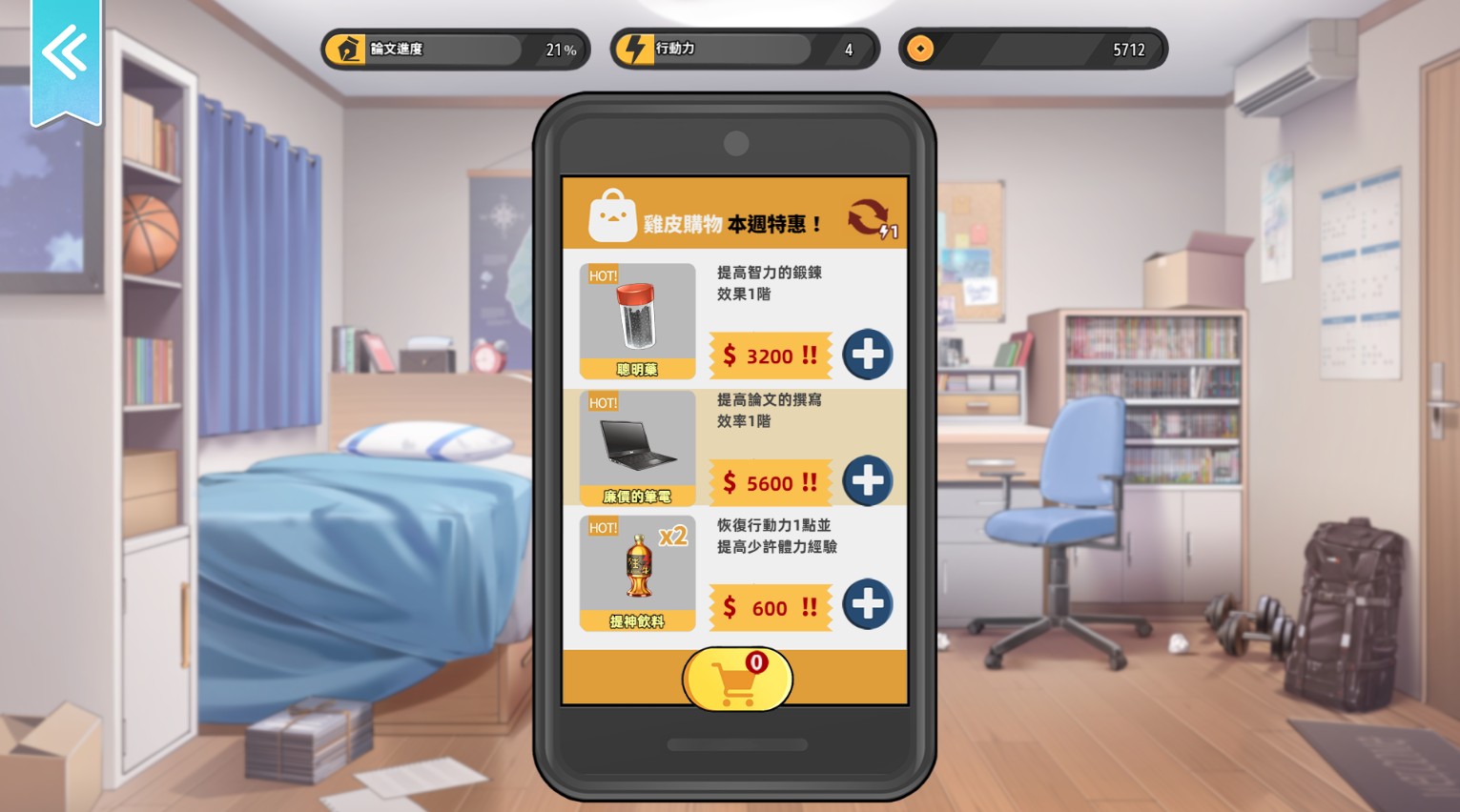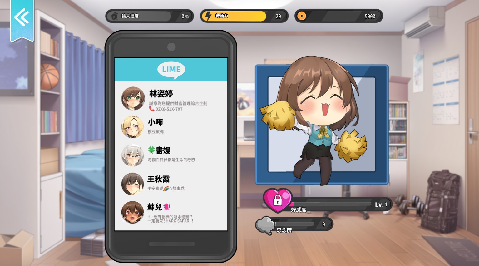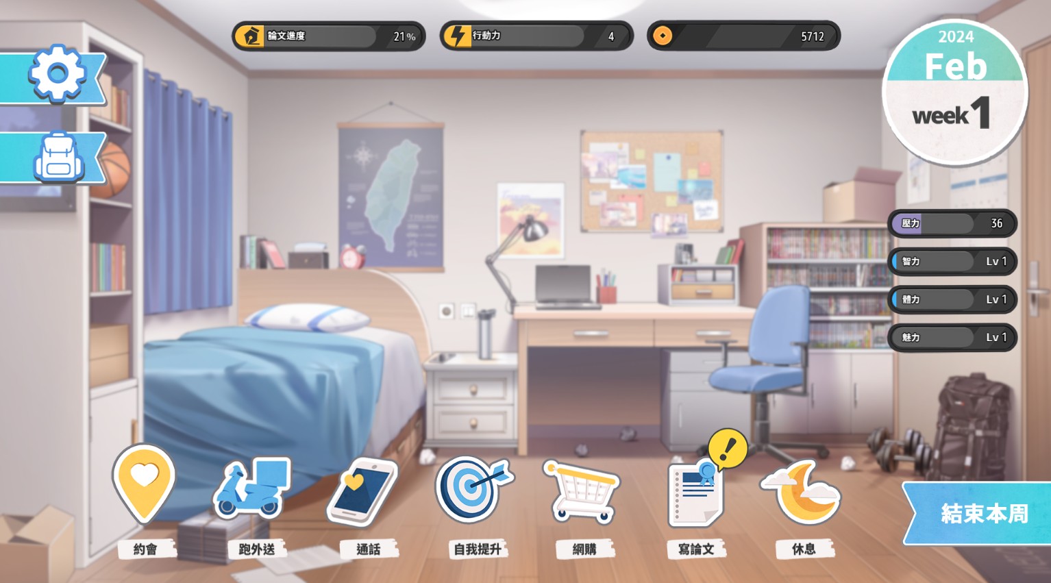 从介面来看,行动力基本上影响大部份的行为,不论是约会、跑外送、自我提升数值或写论文都会耗体力,可以预见后续不少剧情需要达到一定程度的数值才能触发解锁。