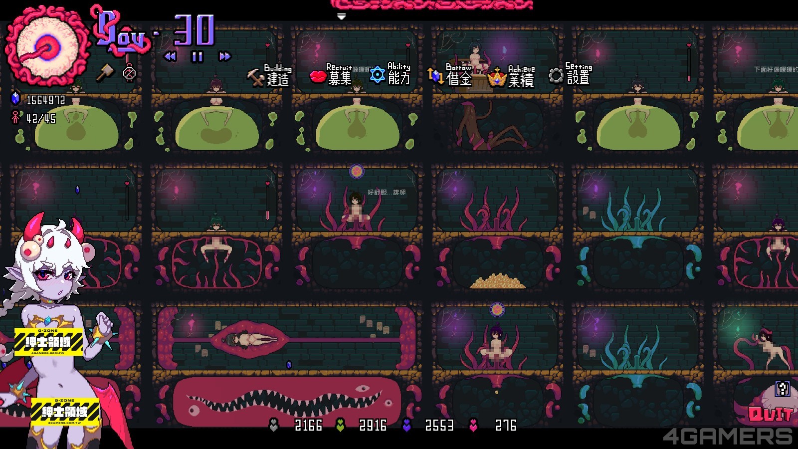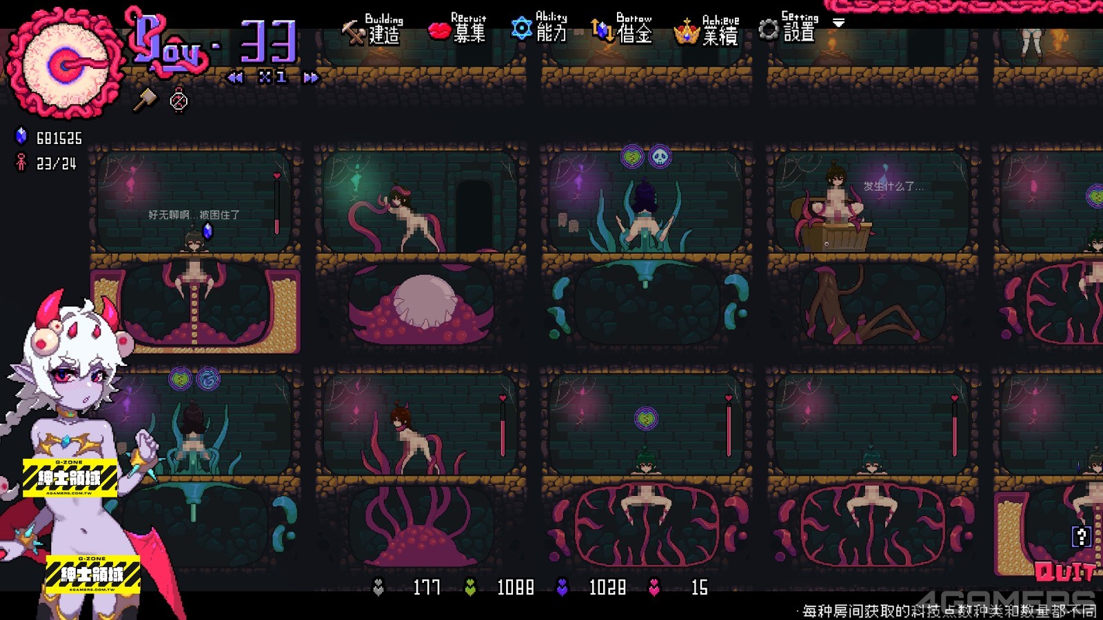 这些负责榨乾冒险者的地穴包括:一般触手、宝箱怪、史莱姆、丸吞怪、子宫注卵机、母体产卵机等等,对应榨出魔力的基本需求;而为了加速流程,游戏也可以另外加盖洗脑机、苗床墙壁、人格排泄机、触手卵与人格凝胶存放间等,整体可以建造的房间种类颇为丰富,并且可以透过科技升级。