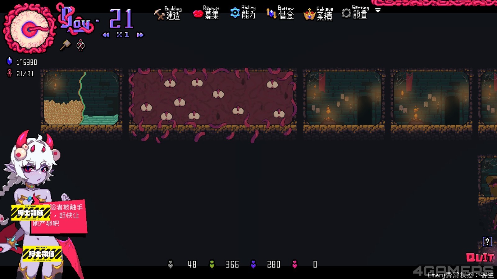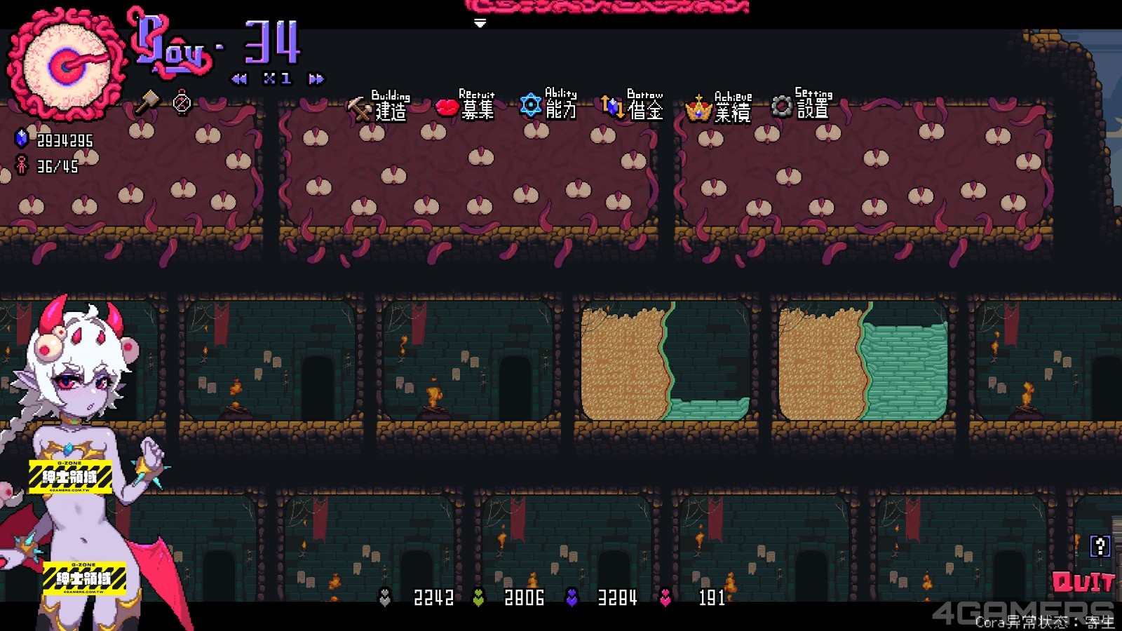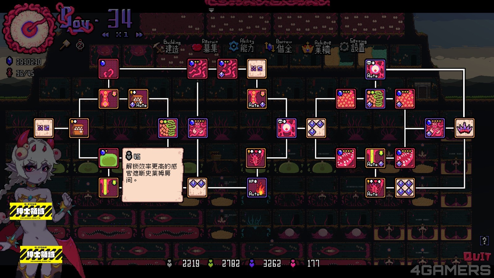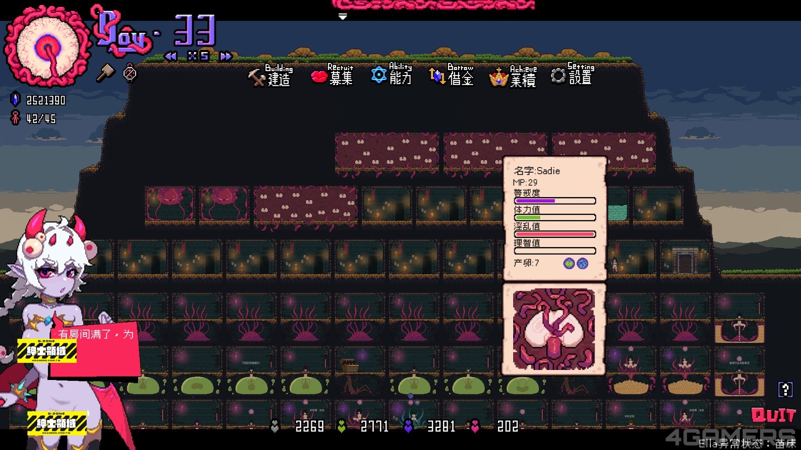 而人类方也发现城镇附近出现了这个神祕的魔王,派出爆乳魔女 Sara 来摧毁这个迷宫。若是在第 35 天前不能把科技树点完,就会游戏失败。