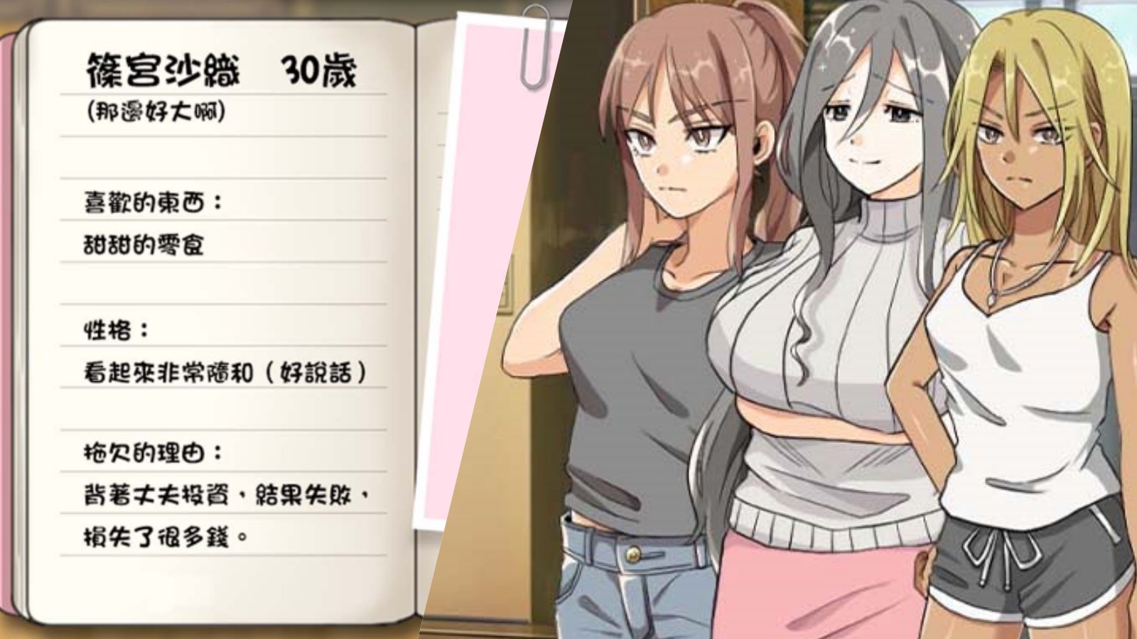 在《太太请你用身体支付房租》游戏中,玩家扮演坐拥多间公寓出租的管理人,面对三位风格迥异的人妻,分别是性格冷酷的今村京子(27),温柔丰满的篠宫沙织(30),以及前暴走族的武田杏奈(24),她们都有共同的债务困境,同时内心深处亦藏有不为人知的慾望。