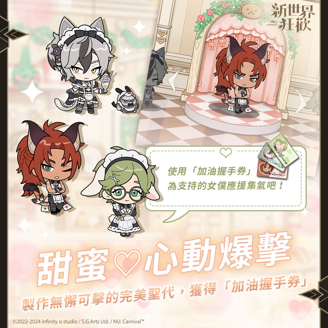 「甜蜜圣代♡」製作完成后,玩家可获得「加油握手券」并在「闪亮集气✩」为你支持的女僕投票应援,当「加油握手券」投入达指定数量时,还能解锁限定故事、专属背景等奖励。