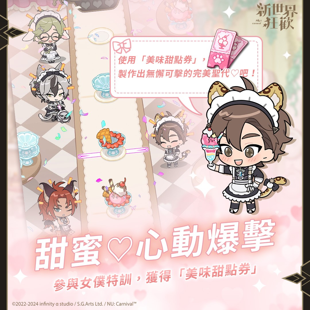 BL 手游《新世界狂欢》9 月 26 日宣布,限时活动「甜蜜♡心动爆击」即日开跑,蜂蜜魔法女僕午茶店在卡莱因大陆正式开幕。