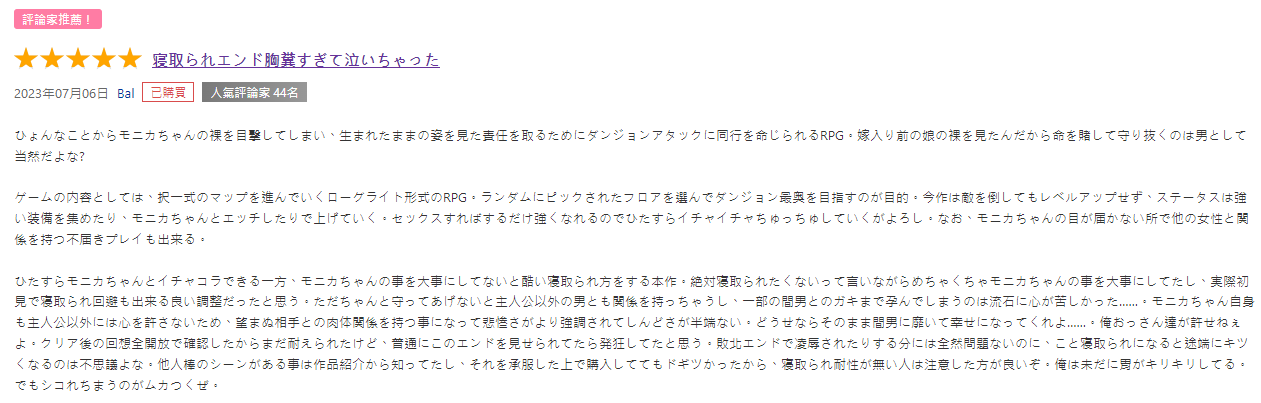 不过,如果你是抱着纯爱之心挑战地下城,切记本作无情的骰子检定可能会导致万劫不复的发展。也许你会比我幸运,但如果一开始没準备好面对 NTR,可能会像这位日本绅士一样,「因为寝取结局感到过于胸粪的哭了出来」。