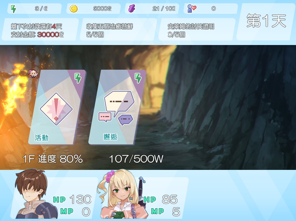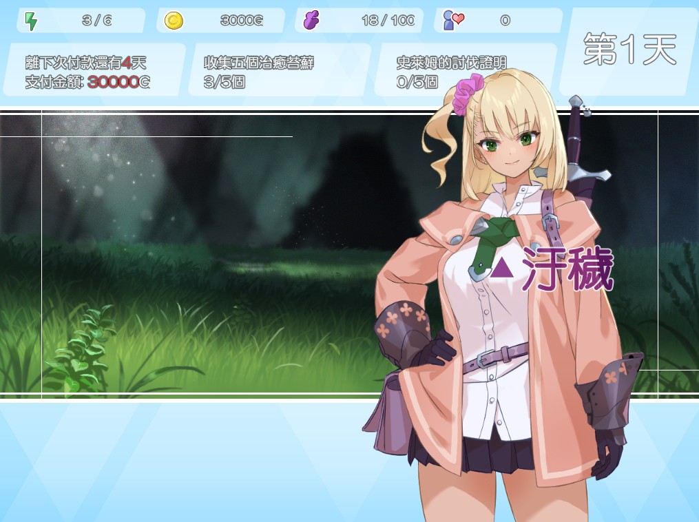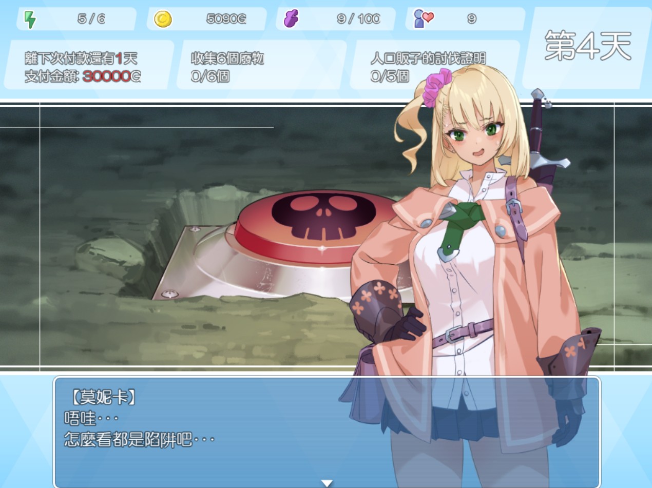 同时,游戏开头也很温馨作出一些提示,例如第 5 天记得要还给公会 3 万金币,同时有女冒险者提醒尽量不要处于疲劳状态返回旅馆(行动力 -1 的情况,返回旅馆莫妮卡会被寝取)。