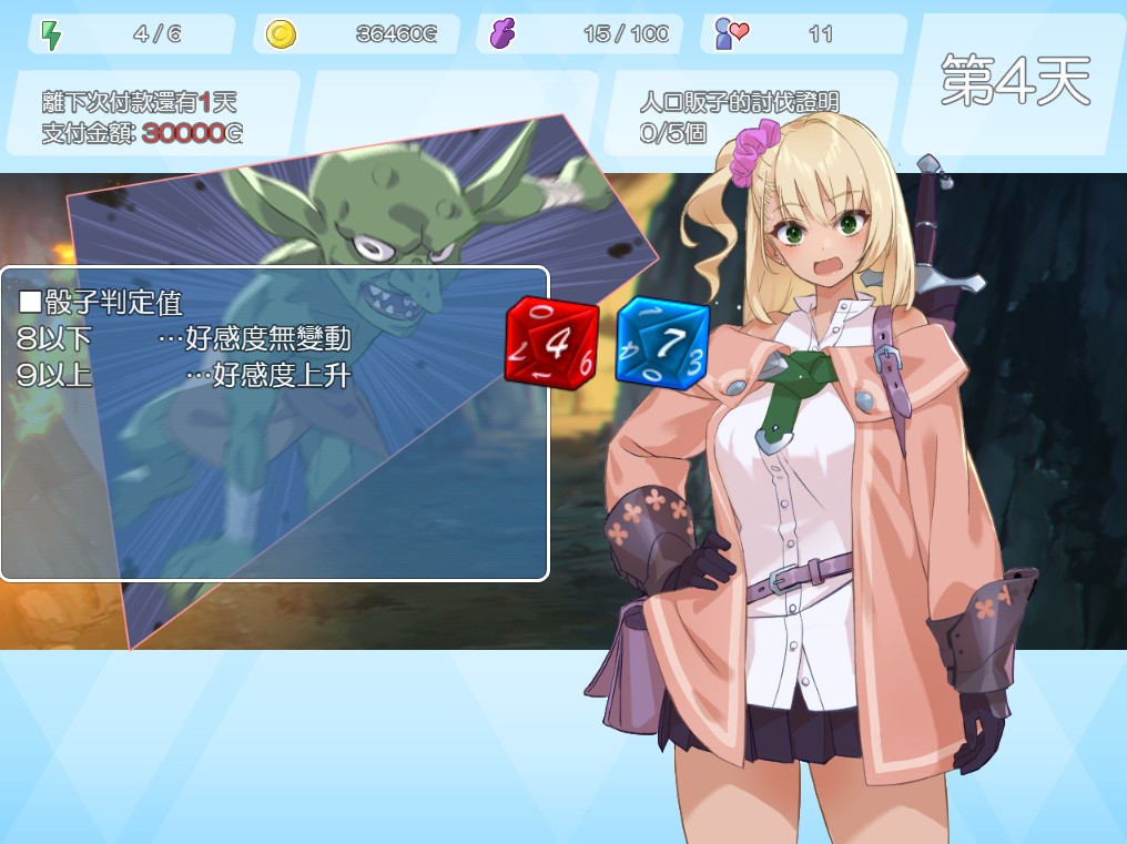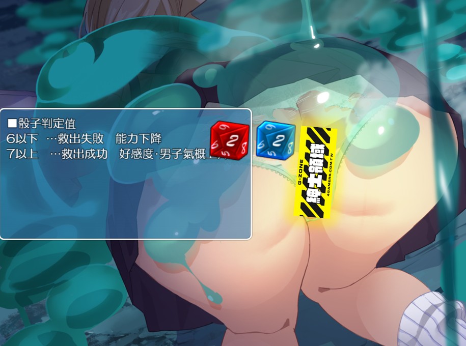 然而,事实上在第一轮游戏过程,我的主角山本在第二天就眼睁睁看着莫妮卡被史莱姆给○了,因为怎幺掷骰,数值都不超过 4。