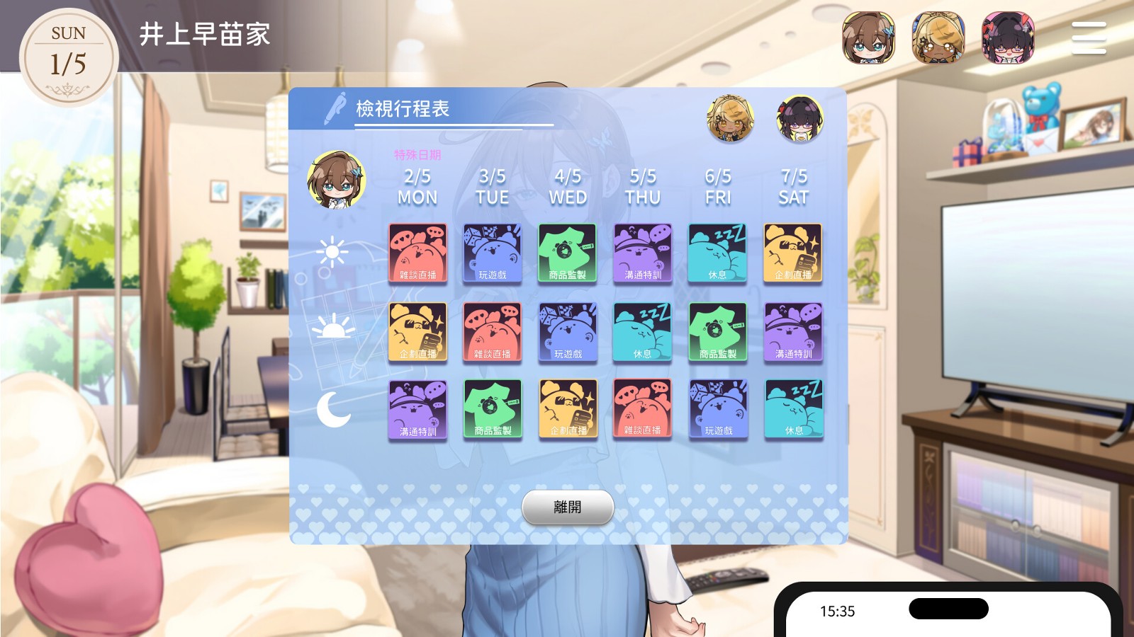根据官方介绍,游戏里玩家可按照三位女主角的能力和目标来合理安排每週行程,并注意她们的身心健康,并强调若未有及时为她们纾缓压力,会迎来不可逆的重大后果。