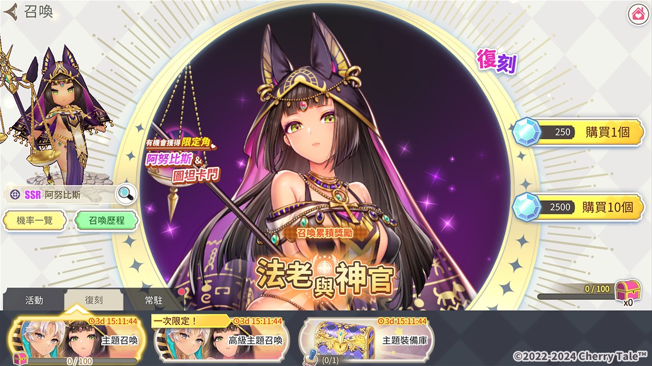 在新开放的「法老与神官」主题召唤中,有机会获得沙漠之都强势角色「阿努比斯」、「图坦卡门」。