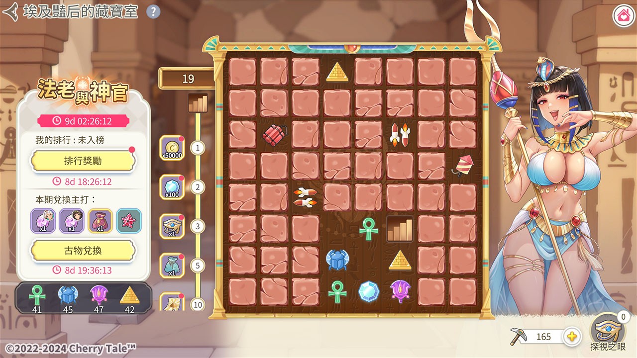 在「藏宝室」除了挖掘到的古物可至古物兑换,在挖掘的过程中有「钻石」、「法老与神官」主题召唤劵、特殊宝石等奖励。当探索到指定的层数,还能领取阿努比斯召唤箱、图坦卡门召唤箱等道具。