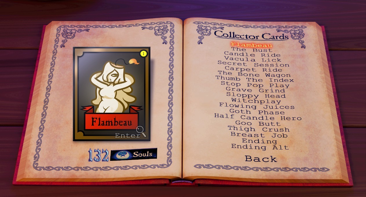 随着玩家击破关卡获取灵魂,便能解锁蜡烛美人的 H 图,玩家的目的便是解锁全部的 H 图片。