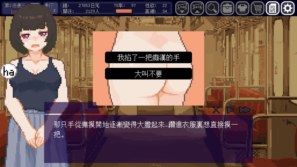 虽然美术是点阵像素风格,但《变身夏日》最大的优点在于对于角色有诸多的分镜刻画,例如室友独自一人时的自慰或色色自拍,或是男主角观察室友睡颜或害羞表情的时候。