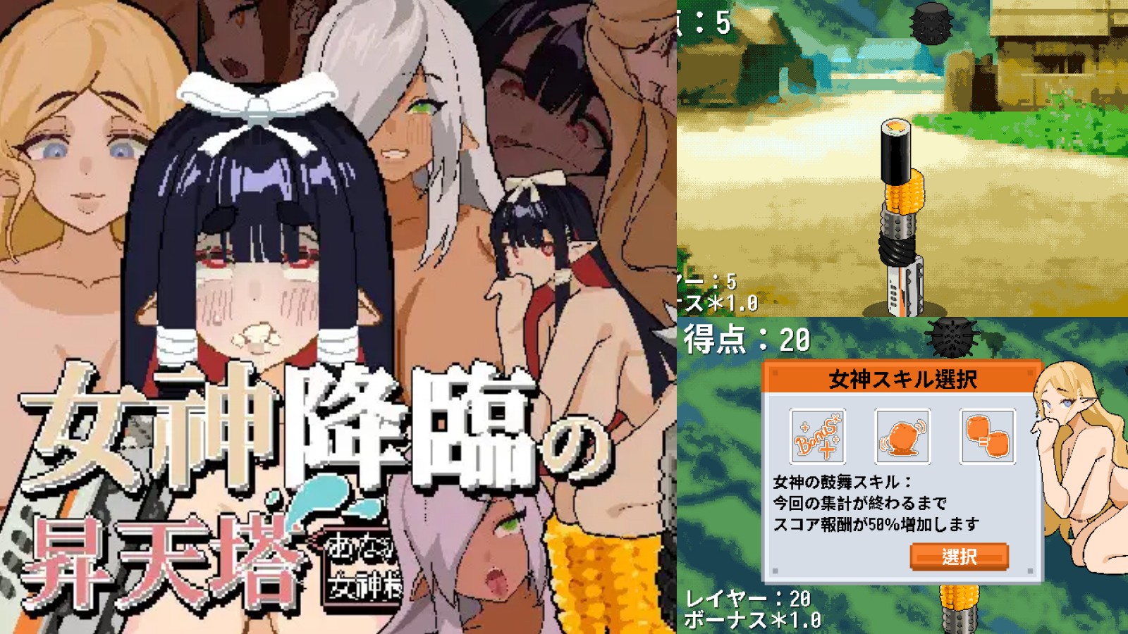 《女神降临的升天塔》是一款 2D 像素绅士游戏,玩家扮演一位信奉女神的工匠,目标是要各种匪夷所思的材料盖出一座高塔,而建筑材料则有寿司捲、玉米、火车车厢、罐头……甚至是能增添闺房乐趣的各种「用品」。