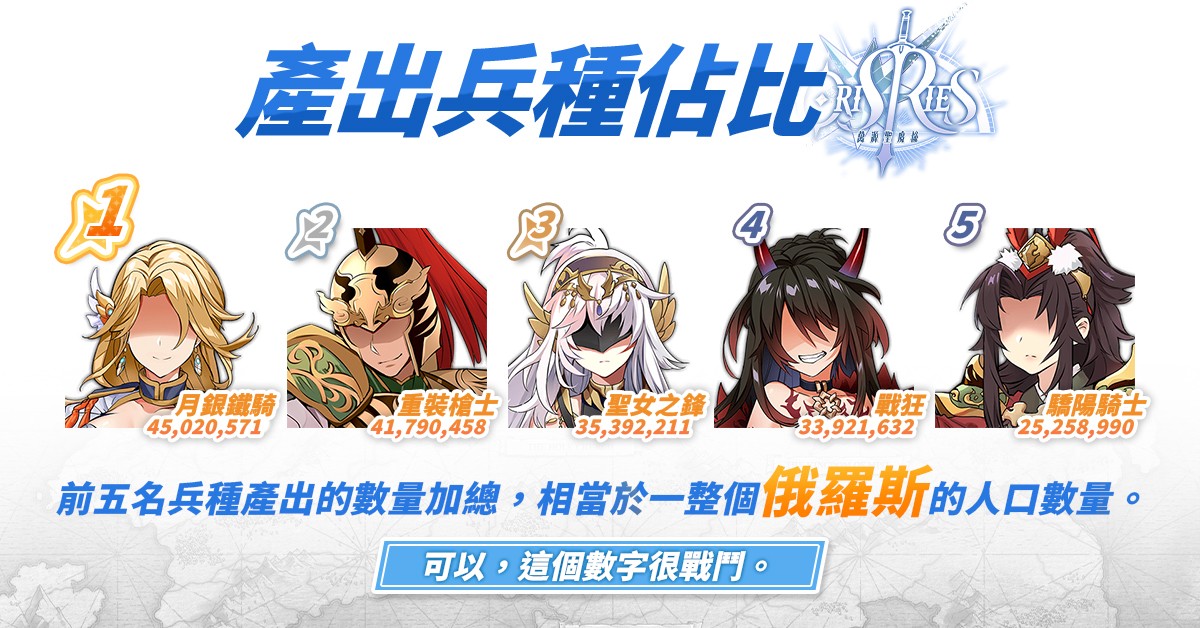 产出兵种佔比最高的前五名兵种,从第一名至第五名分别为:月银铁骑、重装枪士、圣女之锋、战狂、骄阳骑士。前五名兵种产出的数量加总,相当于整个俄罗斯的人口数量。