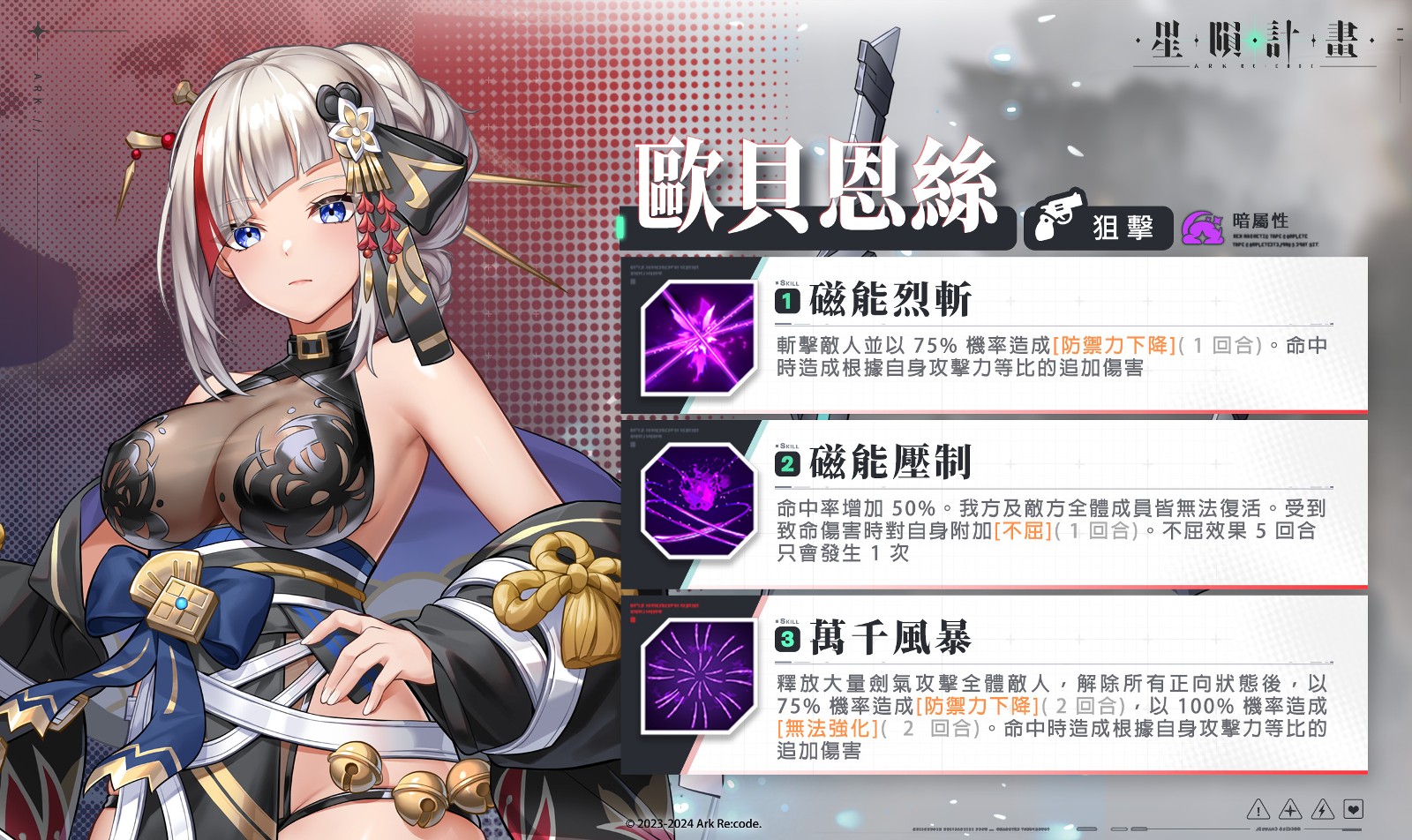 欧贝恩丝 S2 能够禁止敌我双方复活特性,并在受到致命伤害时对自身附加不屈效果,并大幅提升命中率。S1、S3 不仅都具有降低防御力的效果,还会对敌人追加一段伤害;其中 S3 技能还会额外赋予「无法强化」状态,让她活跃于竞技场之中。