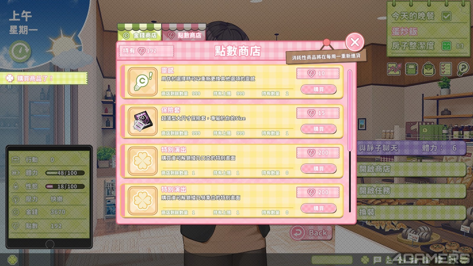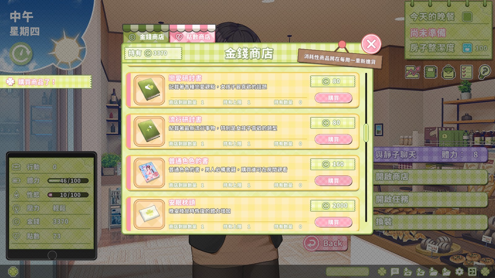 本作有许多机制绑定在女主角们的故事进度,其中是前期较为关键的女主角是静子,她的商店会贩卖许多重要的道具,前期金钱建议优先购买一些恢复体力的食物,以及一些料理书改变菜单,还有提升好感度相关的道具。