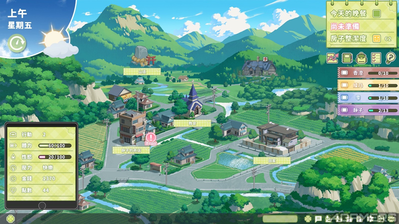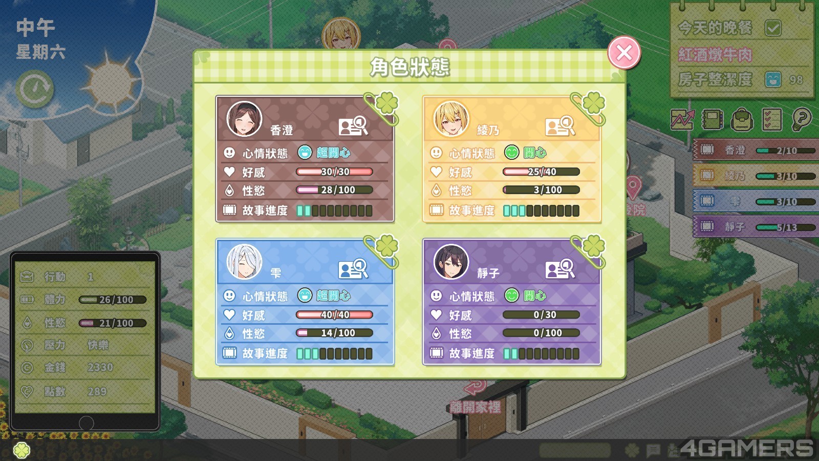 游戏的进行简单易懂,大致上是先将女主角的好感度升满,然后再依照事件规定的时间,在地图场景消耗体力触发事件。