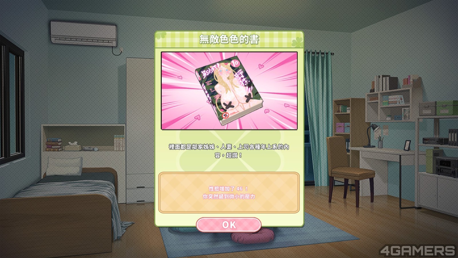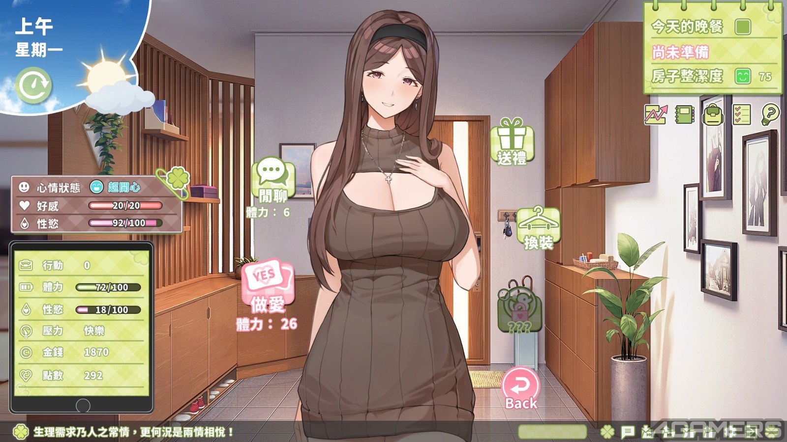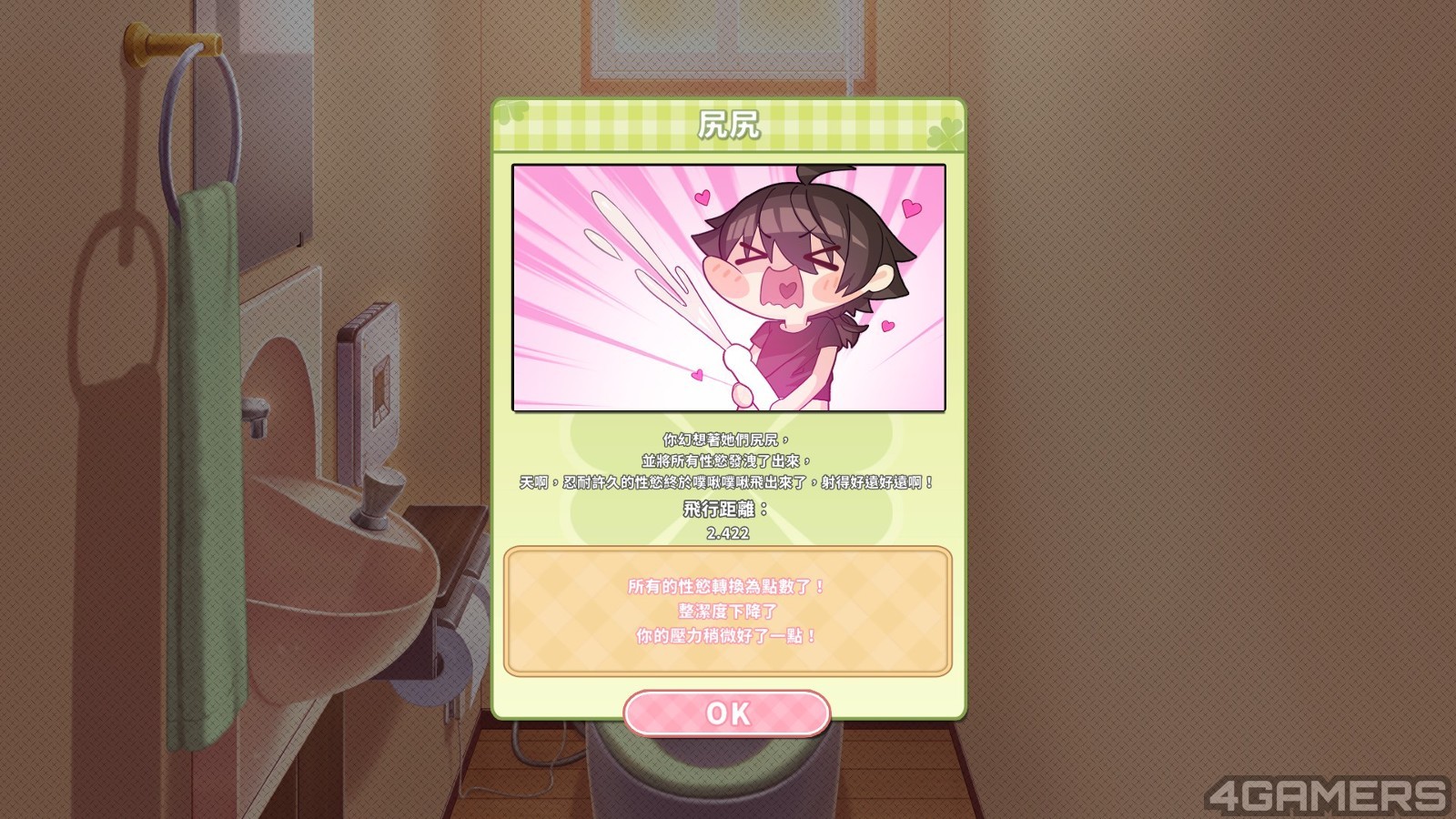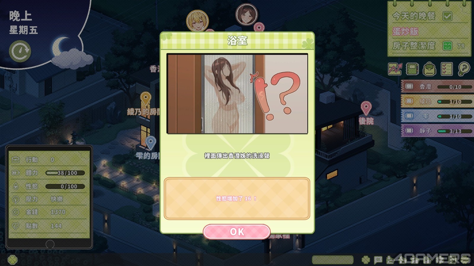 例如,当女主角的色慾值升高,而她位置处在房间、厕所或浴室,往往会有特殊的事件,而主角的色慾值如果满到 100 也会有额外的梦遗事件,这部份还有 Steam 成就,算是相当用心。