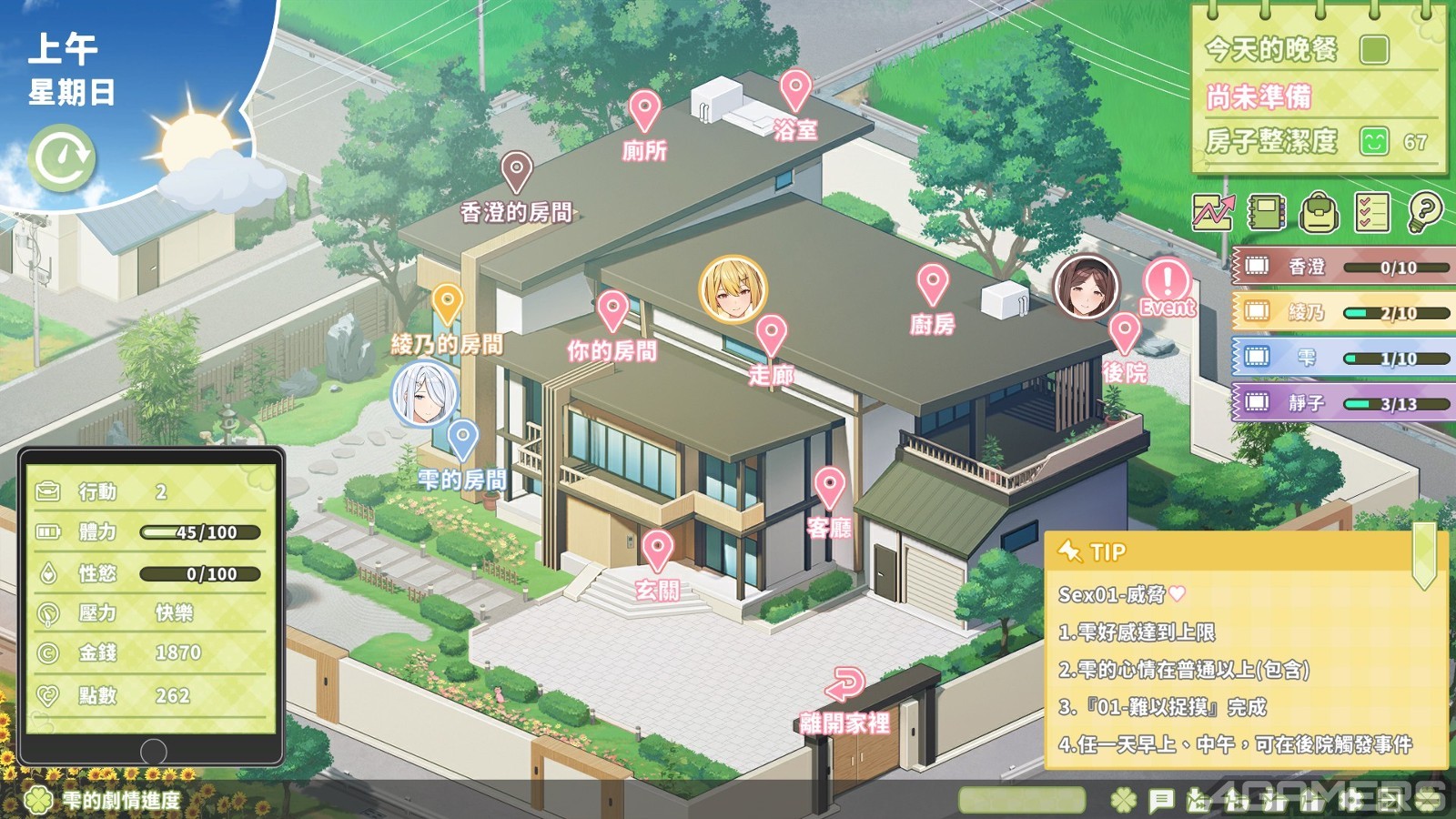 而前面提到静子的重要性,玩家必须完成静子好感度事件 4 之后才能解锁废弃医院,并接取更多每周任务来赚钱,同时也别忘了从点数商店(透过做爱将性慾转换为点数)购买重要的保险套(前期插入必须準备,否则女主角们不给)与 H 分镜福利。