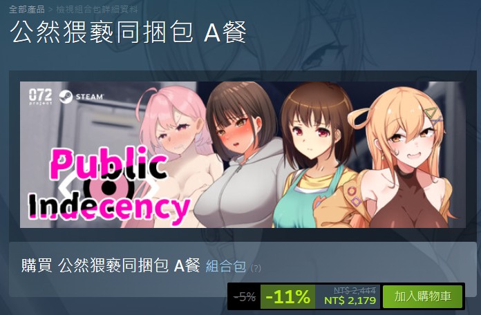 因应《满车率 300%》上市,072 Project 推出一波「公然猥亵同捆包」,主要收录 4 款作品,包含刚发售的《满车率 300%》在内,还有先前广获好评的《全裸徘徊的女子大学生》、野外露出系《夜行》、以及同居题材《悄语承诺 DAYS》,同捆包 B 餐则是多了一款《米蕾奴与淫慾神殿》。