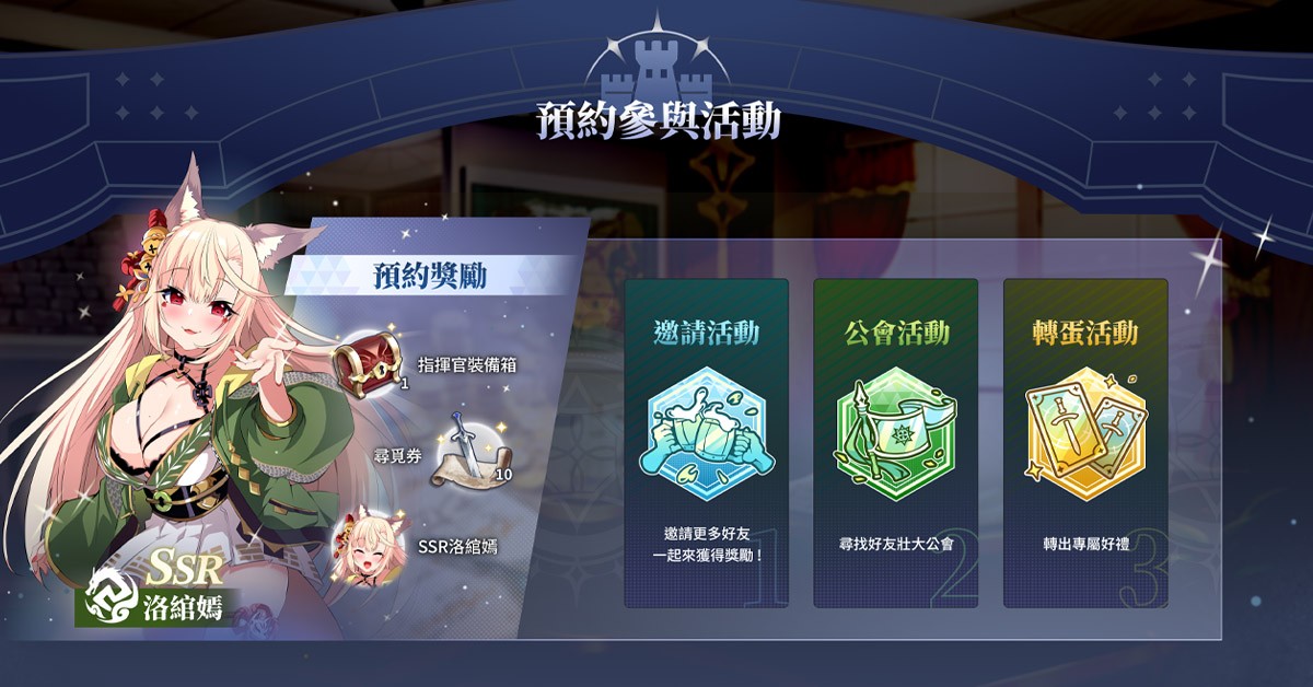 即日起前往事前登录网页预约,即可获得指挥官装备箱、寻觅券,以及妖狐族兽耳娘 SSR 品质英雄-洛绾嫣。你也能透过邀请好友、公会活动来壮大自己势力版图并获取转蛋券。