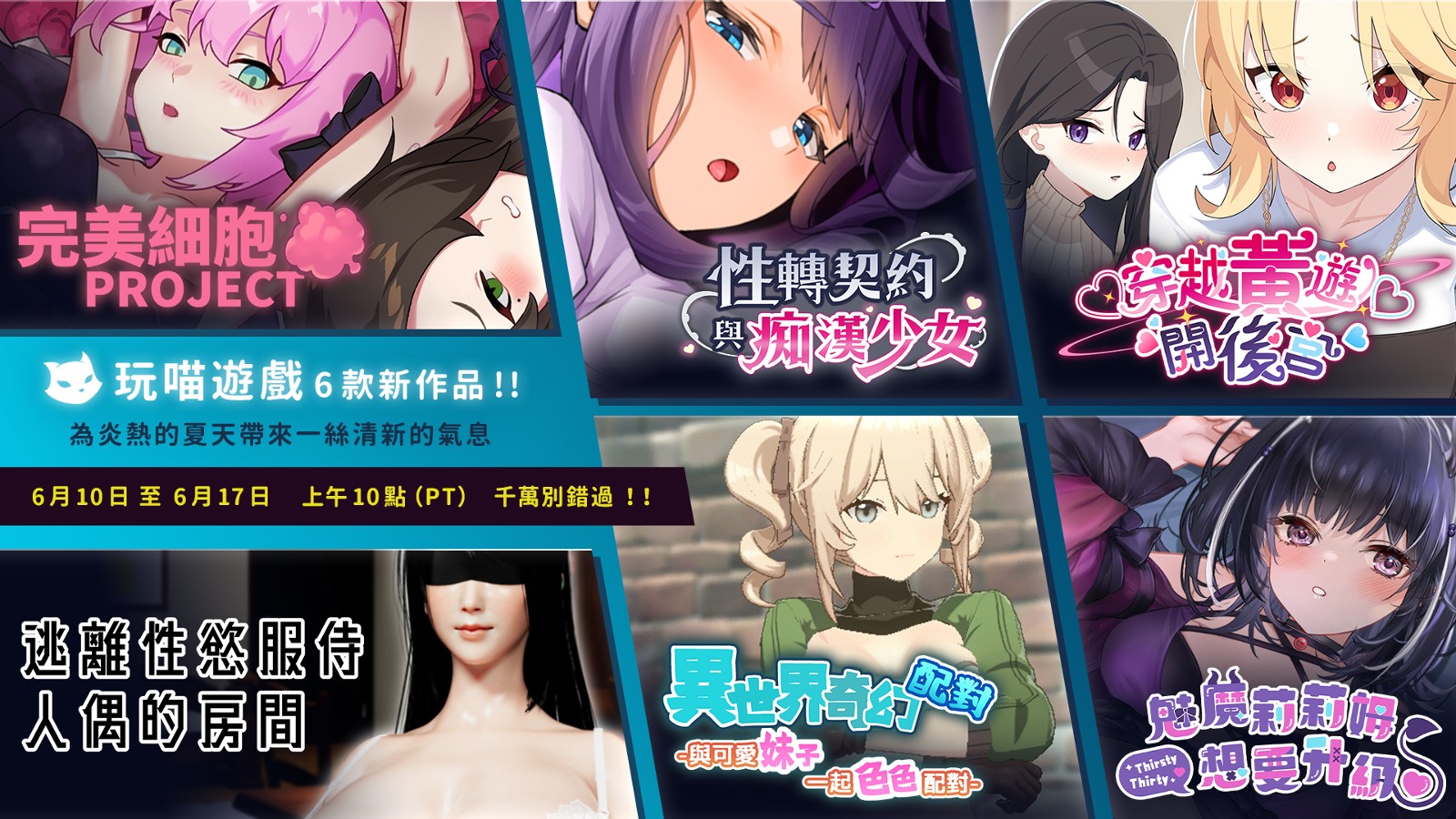 Steam 新品节已在 6 月 11 日凌晨正式开跑,台湾成人游戏发行商「玩喵游戏」(Playmeow Games)一口气公开旗下 6 款发行绅士作品免费试玩。