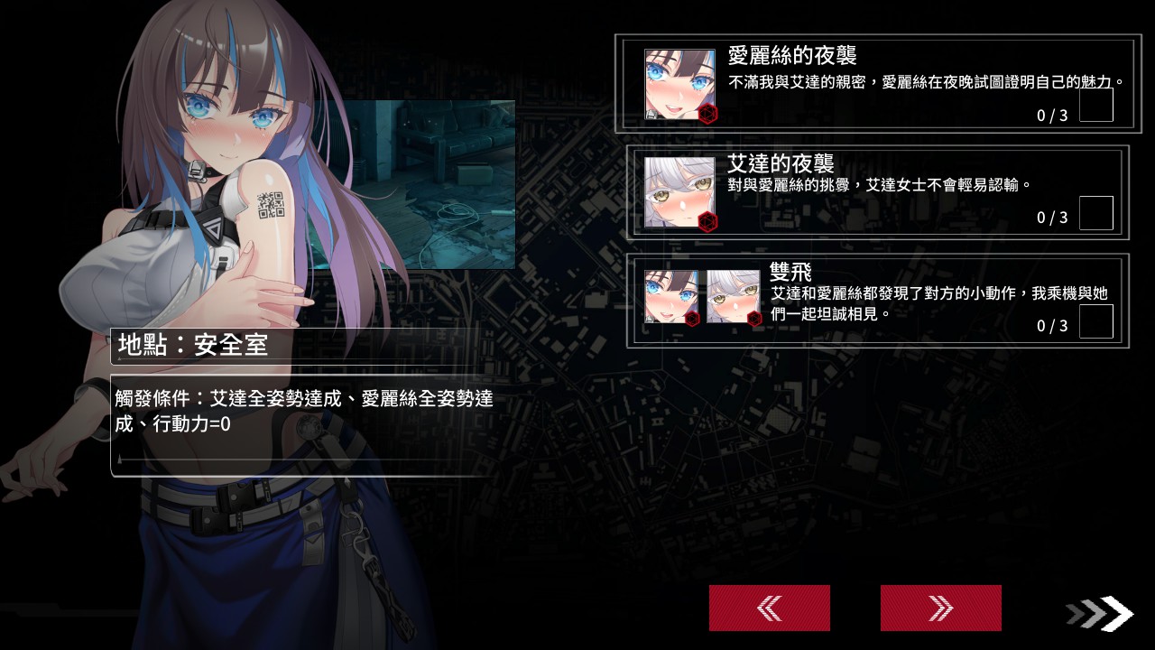 同时,本作会随着每一日的生存而增加「崩溃值」,该数值将决定通关的不同结局,想降低崩溃值可透过药物、休息或与女主角们做爱来降低。