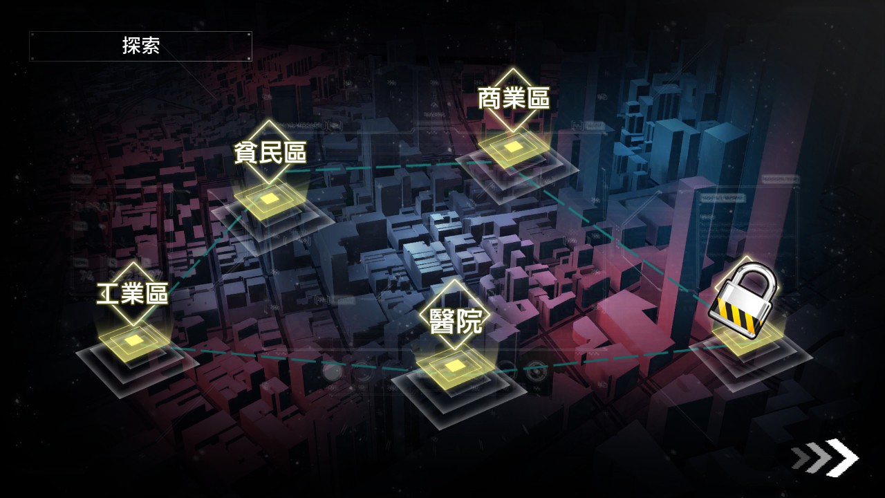 游戏本身的探索机制主要围绕在贫民区、商业区、医院 4 个地点,透过装备的战力来决定遇到战斗是否胜利,而每个区域也决定了获得的资源不同,像是食物、建材或武器等。