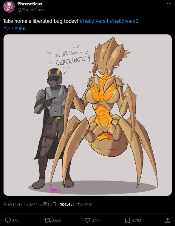 近日,由海外绘师 Pace 以《绝地战兵 2》阔步虫为模板,重新将其创作为日系美女的插图受到万千绅士好评,并将她称之为「阔步虫妈咪」,还打趣说希望不会因为这张图受到真理部的军法审判。