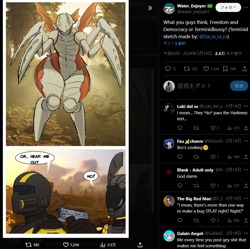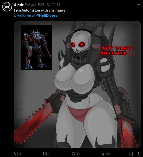 但凡受到欢迎的游戏,网路上必然有源源不绝的粉丝创作,这些创作中一定包含「Rule 34」法则的成人创作,近期海外社群热衷于民主外送合作射击游戏《绝地战兵 2》(Helldivers 2),同时 SNS 上渐渐出现不少 NSFW 创作获得许多绅士好评。