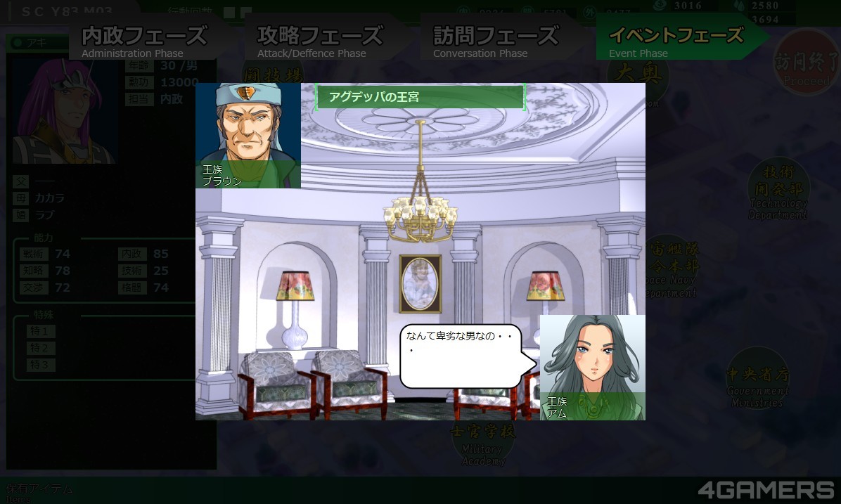 例如说笔者这次选的是「亚姓王族」(名字开头是ア的霸王)的「亚奇」(アキ),会有霸王愿意捧着钱来买你老婆「拉芙」一天晚上,如果答应了,之后会生出一名女儿,而这名女儿则是未来故事中「亚奇」最强军师「拉」出现的前置事件。