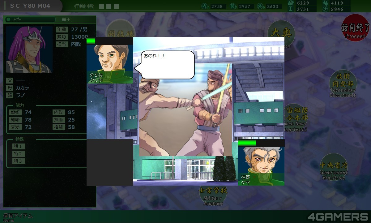 例如说到酒馆可能会遇上高谈阔论的在野武将,如果能说服他就能获得对方的效忠,在开发中心听取开发人员的简报,有机会加速新武器的开发,或是很简单的与属下聊天喝酒谈心,以获得对方的信任。