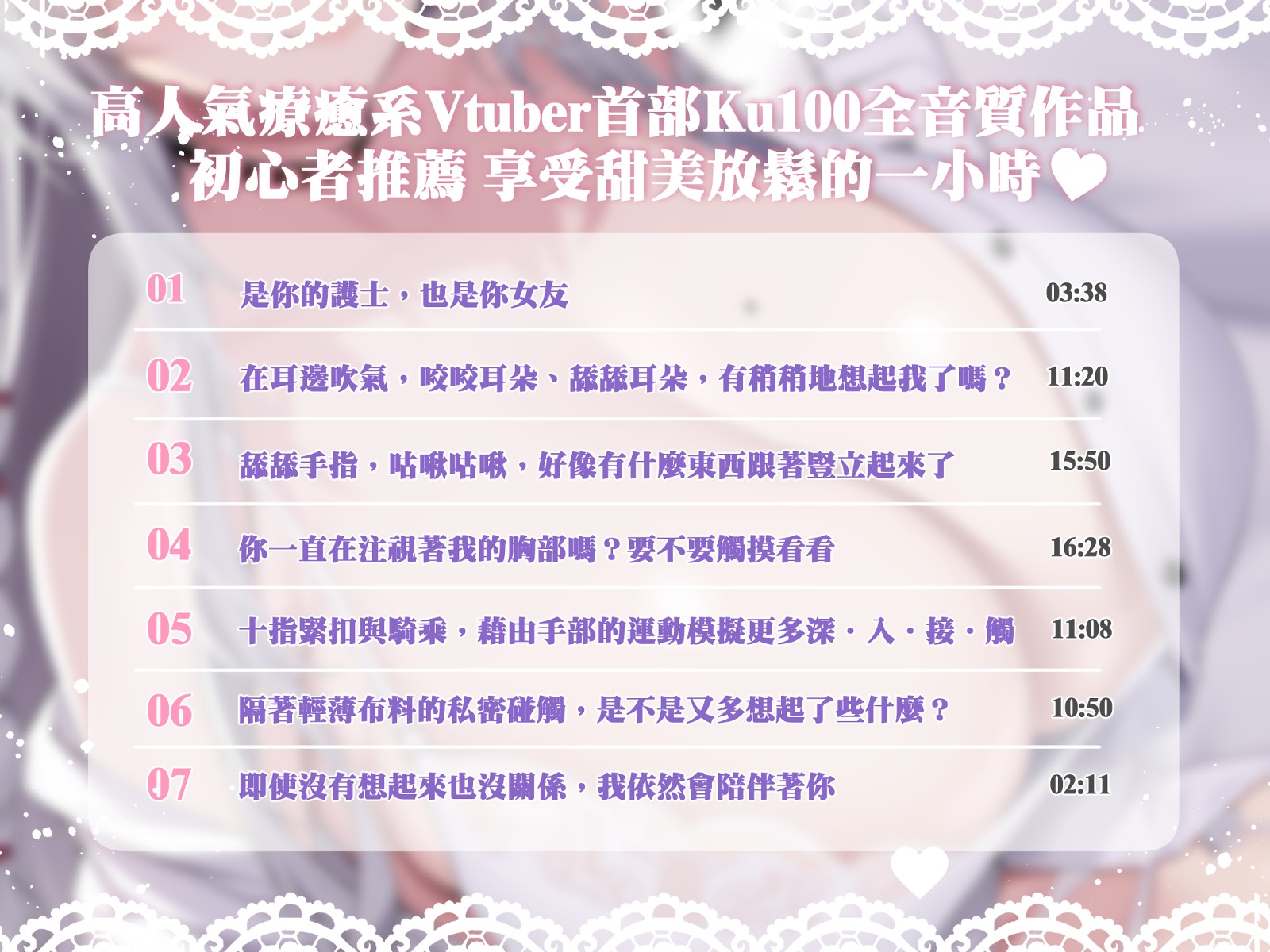 而《无微不至的呵护》故事剧本则为阿欧依扮演护士女友,为了照顾因病在床四年且失忆的主角你,由上而下地展开亲密诊疗过程,试图唤醒沉睡已久的记忆。