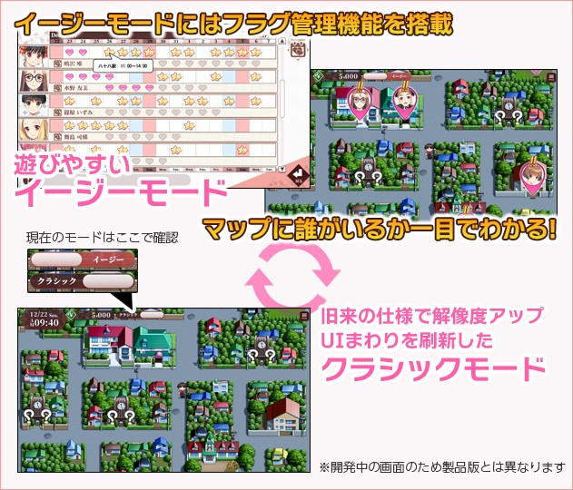 重製版的画面不仅在人物角色重新绘製,UI 介面也一併调整并有 Full HD 画质。根据官方资讯,重製版将带来「Easy Mode」简易模式,可即时在地图显示女主角们的位置所在,而「Classic Mode」经典模式则是回归原作精神不会显示。