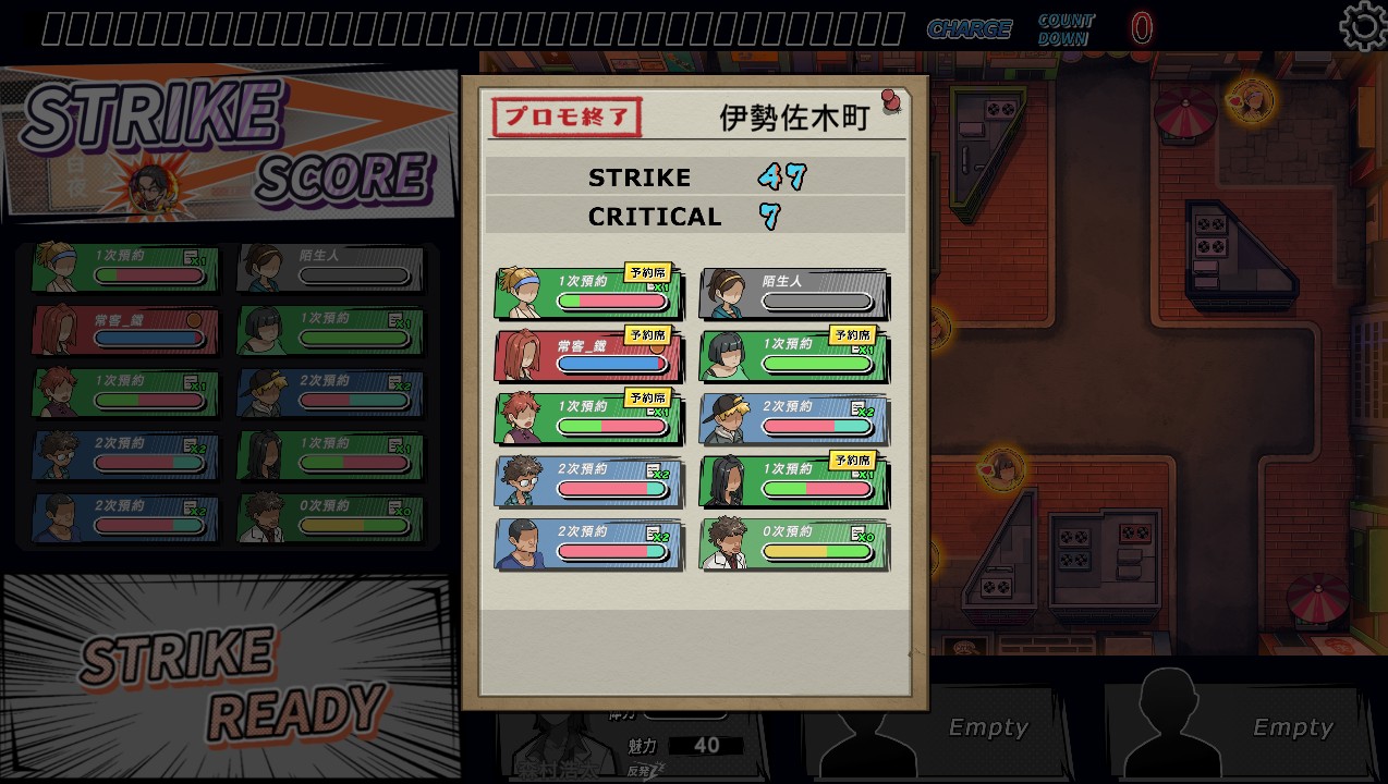 结束营业后,玩家可选择许多行动来展开浩太的夜生活,其中一项便是外出拉客/拓展势力,这当中的玩法就类似弹珠,玩家可同时拉到客源,或是藉此招募到新人。