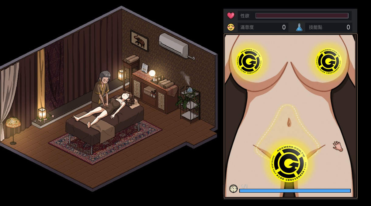 按摩小游戏大致上是以滑鼠操作即可,再正确的区域拖动即可提高满意度与性慾,并进一步解锁福利 CG。