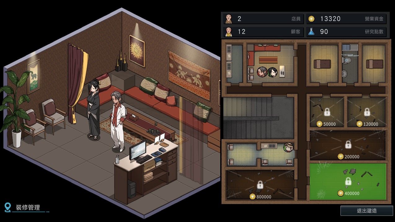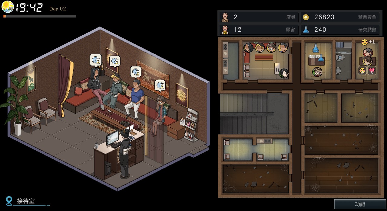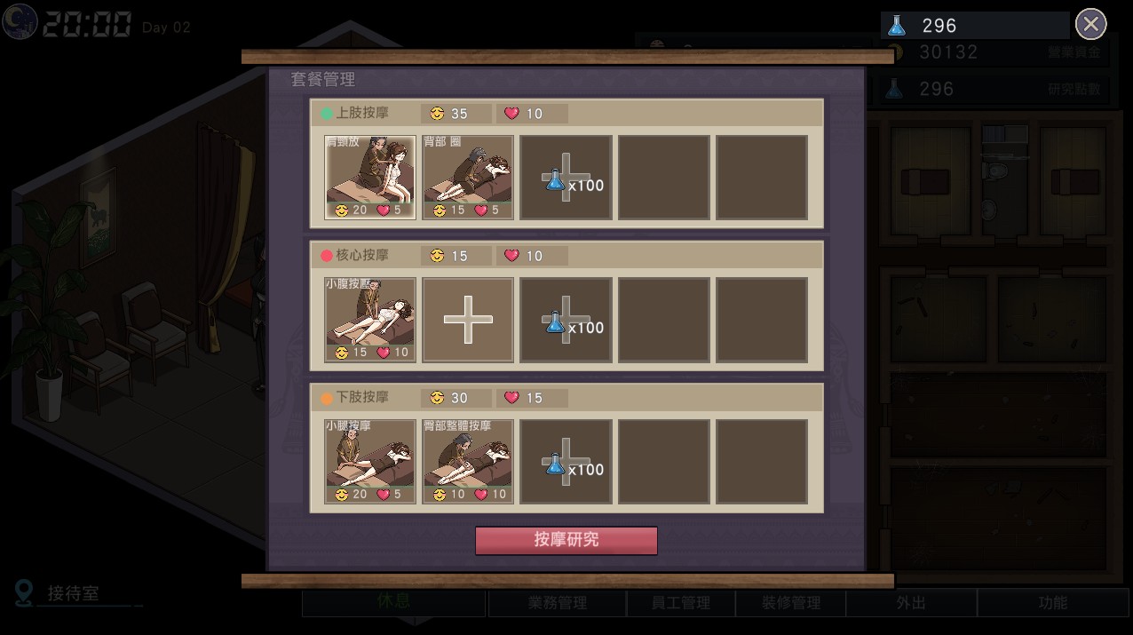 每服务一次客人即可获得金钱、研究点数,同时也会提升客人好感度,每一个动作都需要时间,因此初期也算是时间管理要素慢点。玩家还可客製许多店内的选项,例如按摩菜单或是员工管理,同时特定员工也会触发剧情,让玩家得以解锁福利画面。
