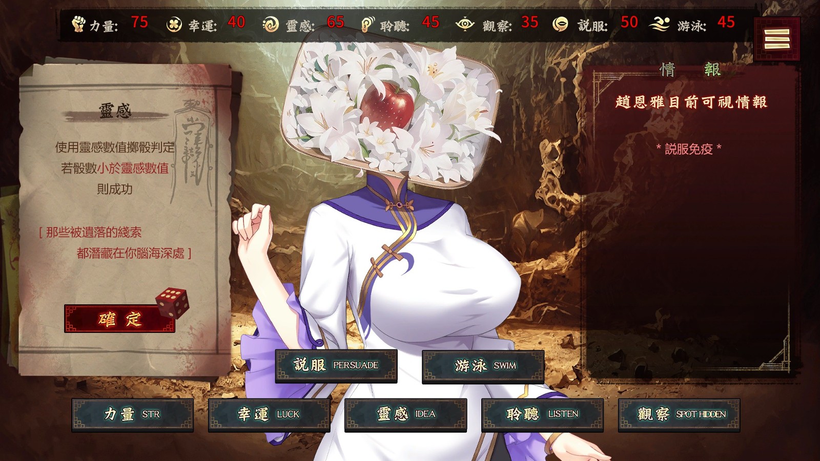每一个选择都会影响到主角与梦梦的亲密度,同时也会影响到【幸福指数】和【服从性】,这些都将是最终结局分歧的变因。