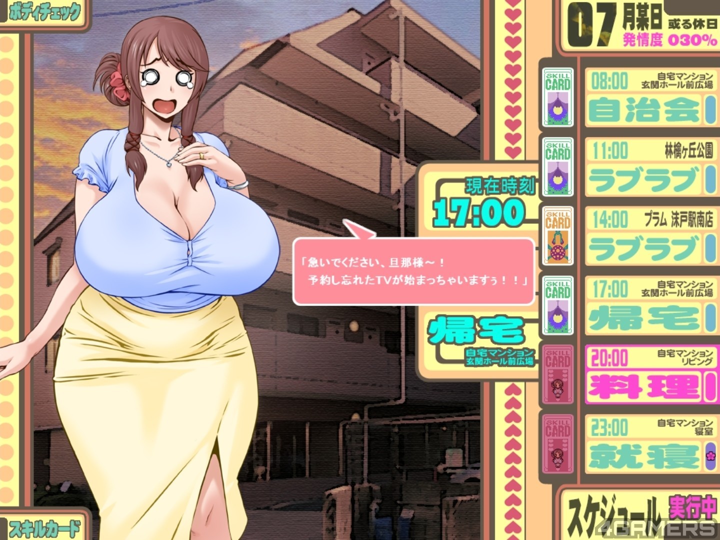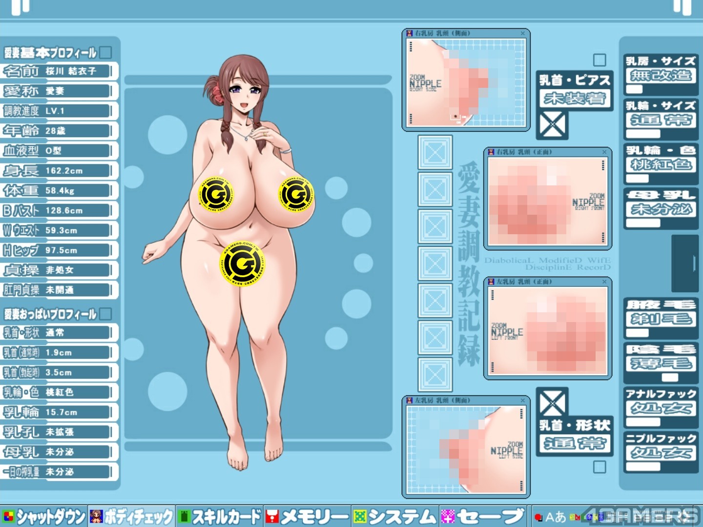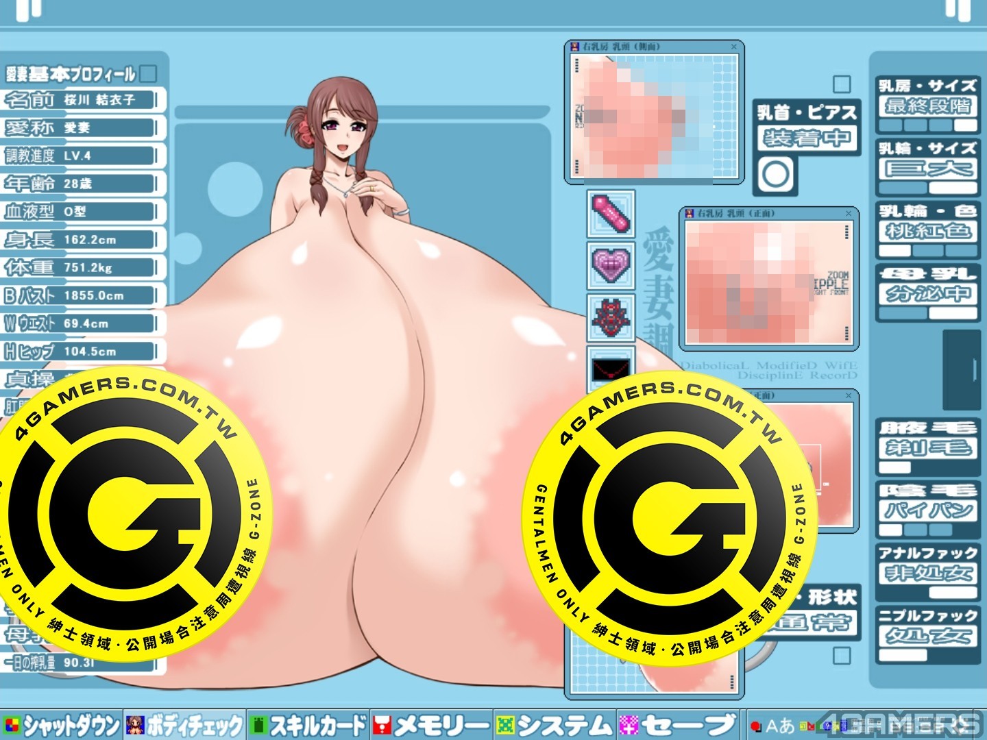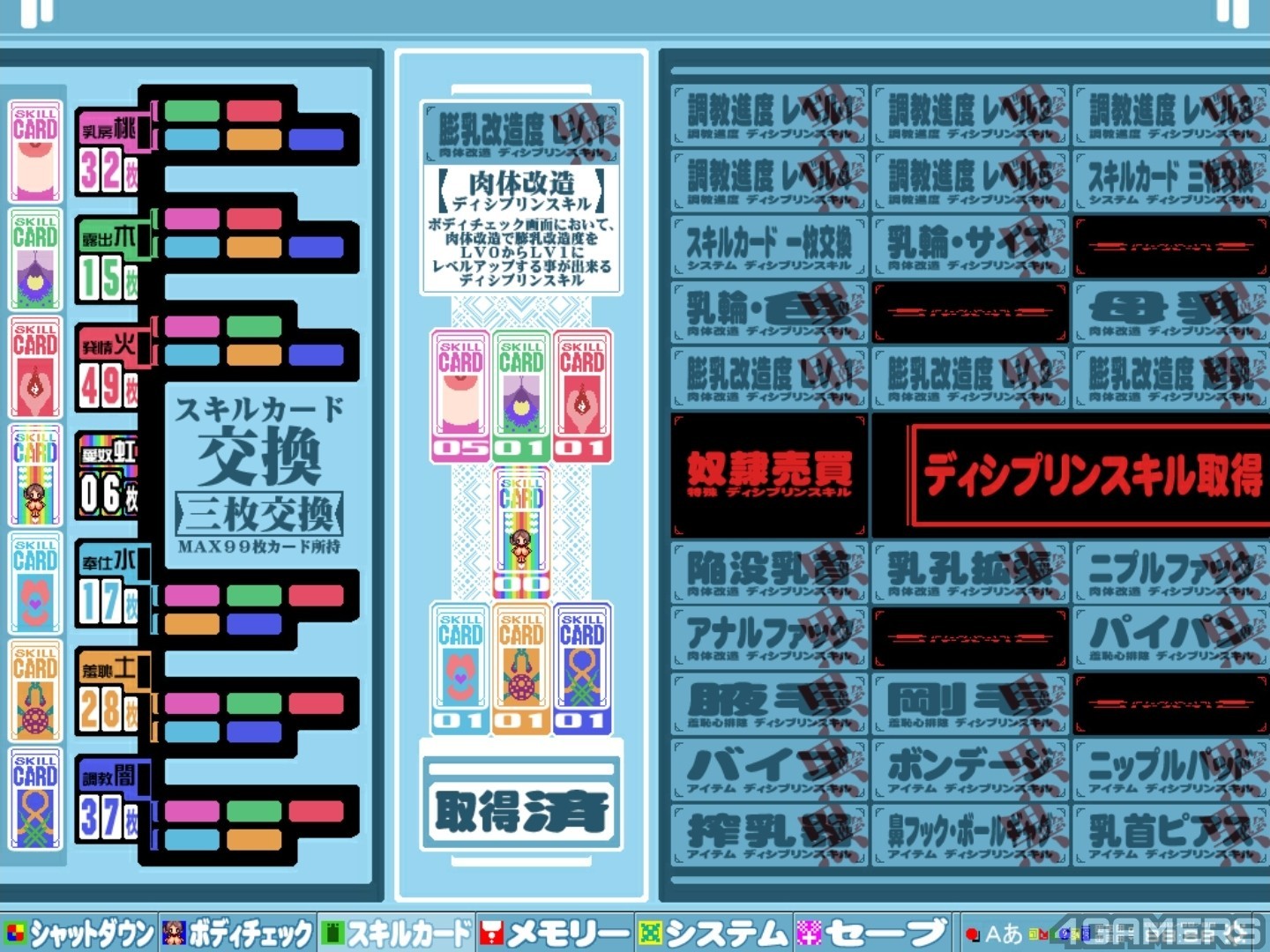 举例来说,「膨乳改造 LV.1」的技能要求是「桃5+木1+火1+水1+土1+闇1」(数字代表张数),玩家只要集到了该数量的卡片,就可以解锁这项技能,结衣子的胸部就可以从原本的 128.6 cm 长大到 236.8 cm。