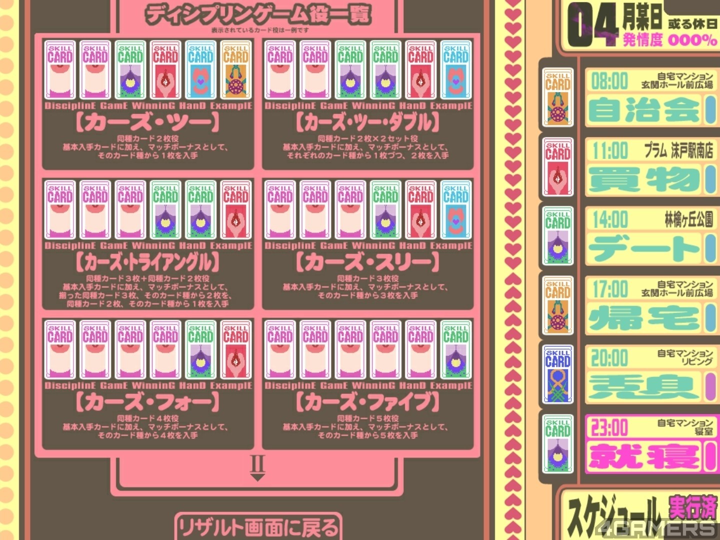 游戏的玩法上,每天结衣子的行程会分为六个时段,每个时段会随机产生一张技能卡片。玩家需要选择其中一个时段以观赏当下的 H 事件,该日结束时会揭开六个时段的卡面是什幺,并按照牌型与选择给予玩家不同数量的卡片。