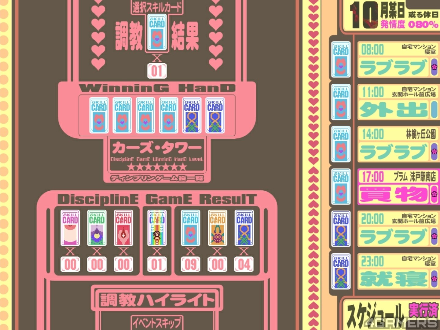 玩家在牌库介面可以从右侧的技能列表中选择一项,如果玩家的牌库中累积了足够多的对应牌面,就可以解锁这个技能,亦即完成对结衣子的该项改造,同时解锁对应的 H 事件。